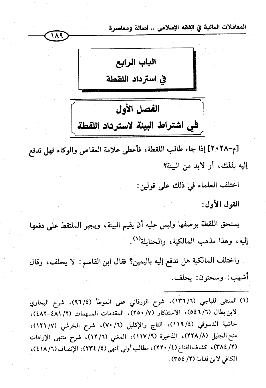 الفصل الأول في اشتراط البينة لاسترداد اللقطة