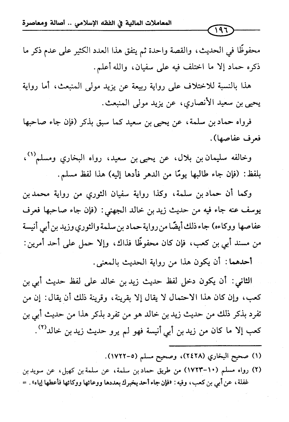 وكما أن حماد بن سلمة، وكذا رواية سفيان الثوري من رواية محمد بن يوسف عنه جاء فيه من حديث زيد بن خالد الجهني: (فإن جاء صاحبها فعرف عفاصها ووكاءه) جاء ذلك أيضًا من رواية حماد بن سلمة والثوري وزيد بن أبي أنيسة من مسند أبي بن كعب، فإن كان محفوظًا فذاك، وإلا حمل على أحد أمرين: