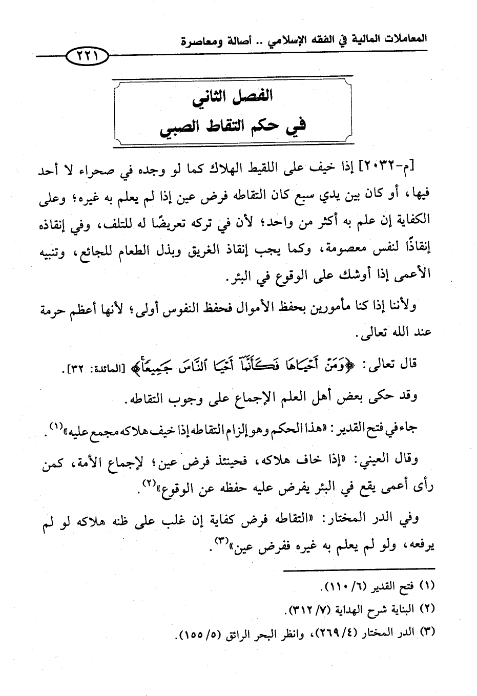 وفي الدر المختار: "التقاطه فرض كفاية إن غلب على ظنه هلاكه لو لم يرفعه، ولو لم يعلم به غيره ففرض عين" (¬٣).