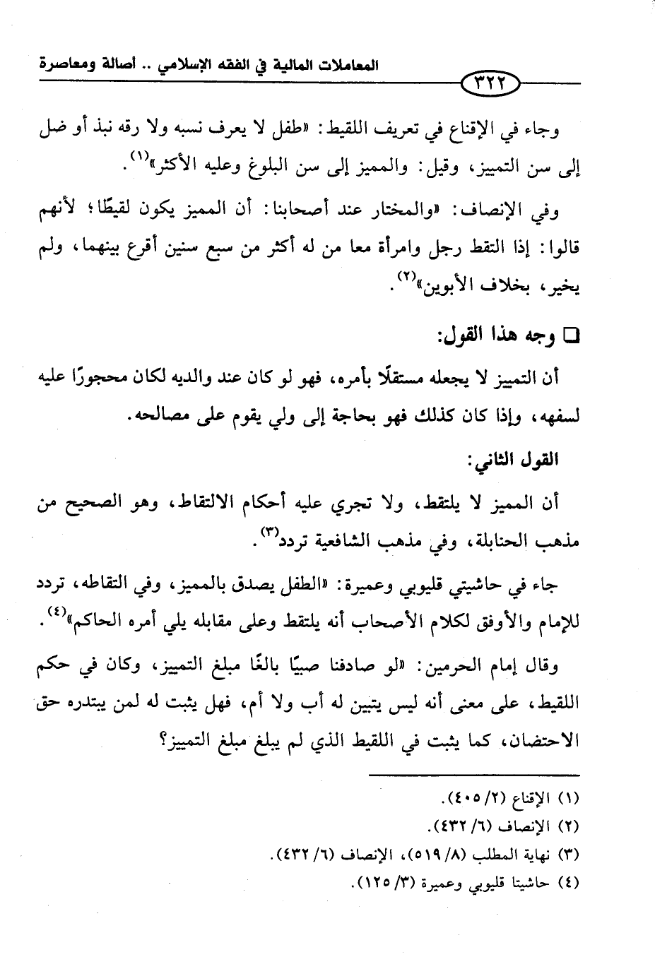 جاء في حاشيتي قليوبي وعميرة: "الطفل يصدق بالمميز، وفي التقاطه، تردد للإمام والأوفق لكلام الأصحاب أنه يلتقط وعلى مقابله يلي أمره الحاكم" (¬٤).