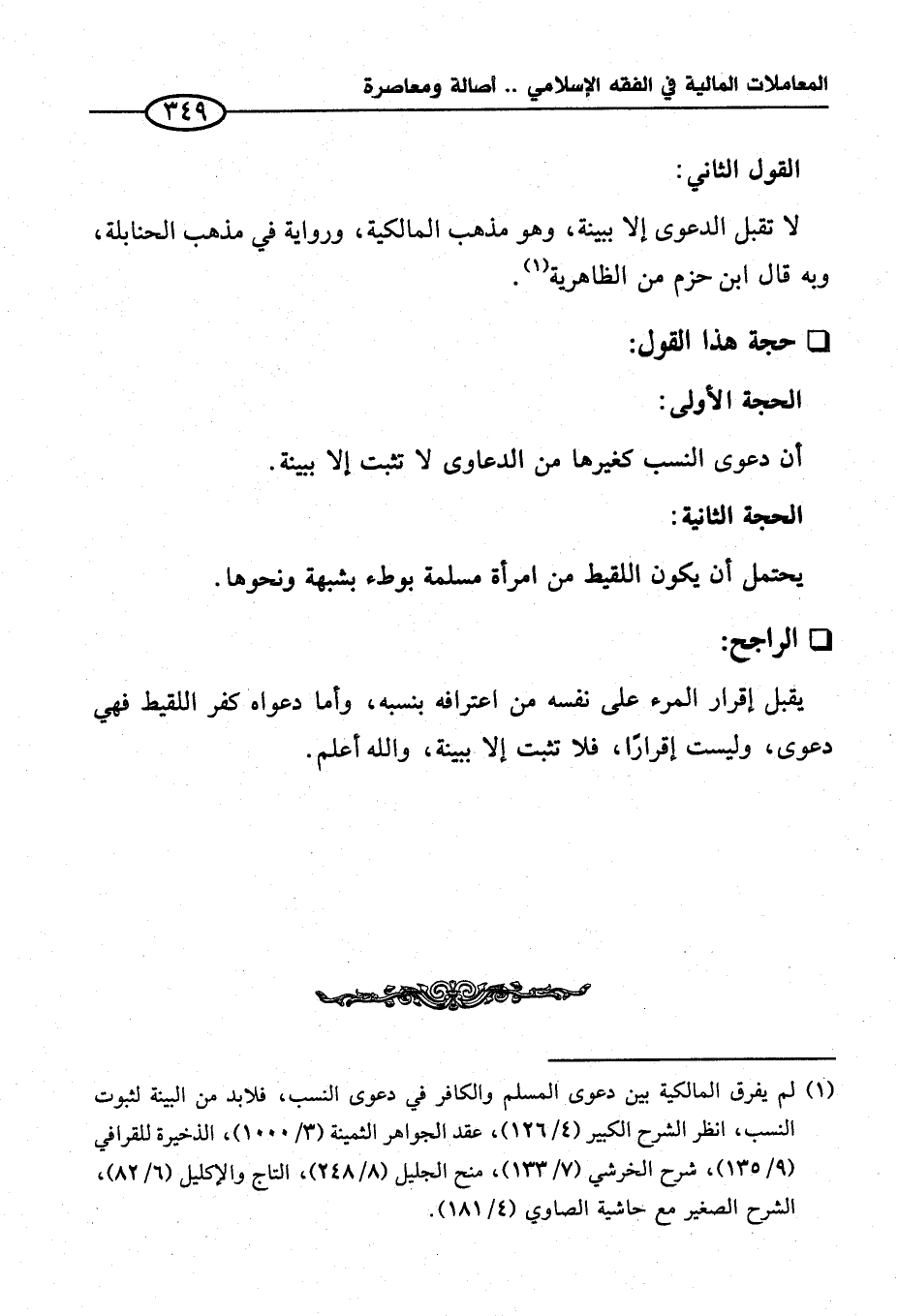 (¬١) لم يفرق المالكية بين دعوى المسلم والكافر في دعوى النسب، فلا بد من البينة لثبوت النسب، انظر الشرح الكبير (٤/ ١٢٦)، عقد الجواهر الثمينة (٣/ ١٠٠٠)، الذخيرة للقرافي (٩/ ١٣٥)، شرح الخرشي (٧/ ١٣٣)، منح الجليل (٨/ ٢٤٨)، التاج والإكليل (٦/ ٨٢)، الشرح الصغير مع حاشية الصاوي (٤/ ١٨١).