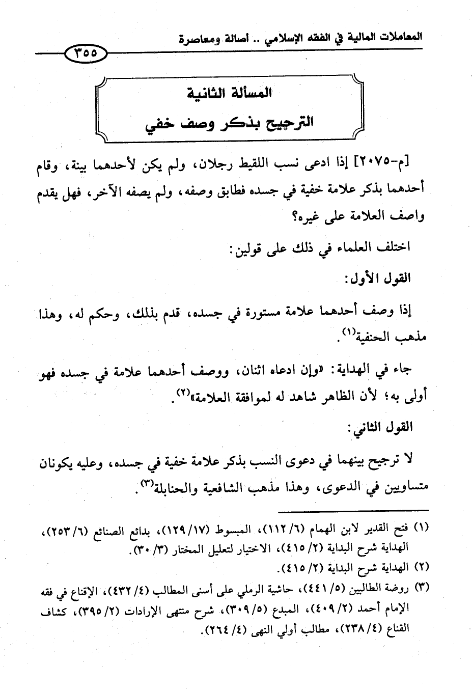 لا ترجيح بينهما في دعوى النسب بذكر علامة خفية في جسده، وعليه يكونان متساويين في الدعوى، وهذا مذهب الشافعية والحنابلة (¬٣).