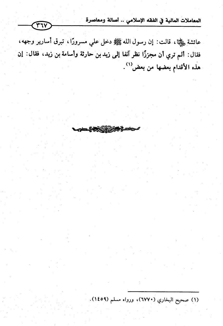 عائشة - رضي الله عنه - قالت: إن رسول الله - صلى الله عليه وسلم - دخل علي مسرورًا، تبرق أسارير وجهه، فقال: ألم تري أن مجززًا نظر آنفا إلى زيد بن حارثة وأسامة بن زيد، فقال: إن هذه الأقدام بعضها من بعض (¬١).
