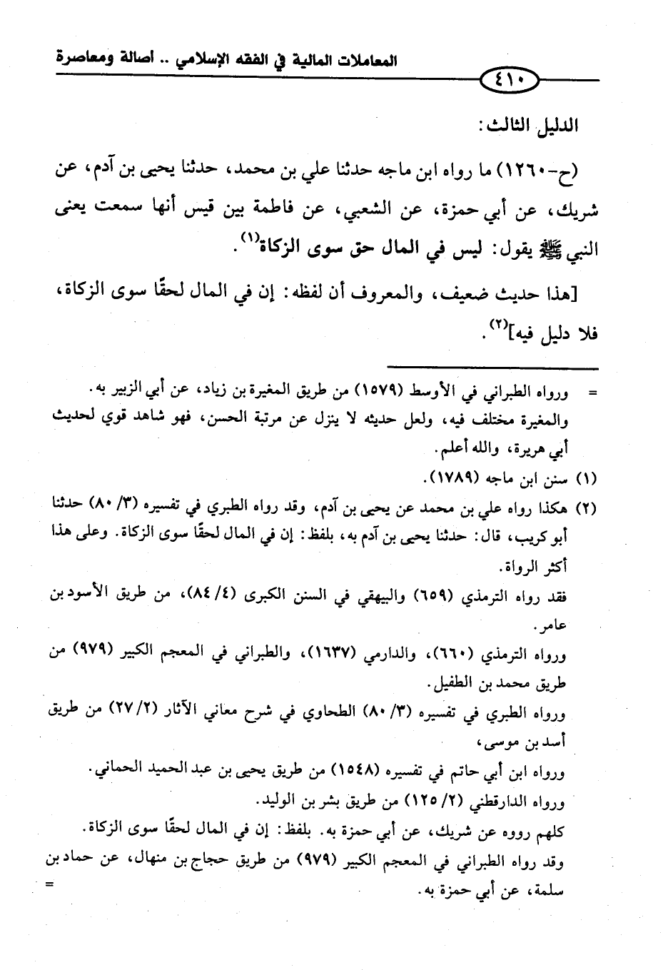(ح-١٢٦٠) ما رواه ابن ماجه حدثنا علي بن محمد، حدثنا يحيى بن آدم، عن شريك، عن أبي حمزة، عن الشعبي، عن فاطمة بنت قيس أنها سمعت يعني النبي - صلى الله عليه وسلم - يقول: ليس في المال حق سوى الزكاة (¬١).