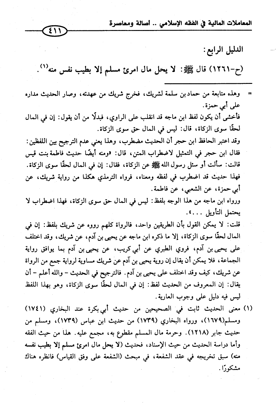 (ح- ١٢٦١) قال - صلى الله عليه وسلم -: "لا يحل مال امرئ مسلم إلا بطيب نفس منه (¬١).