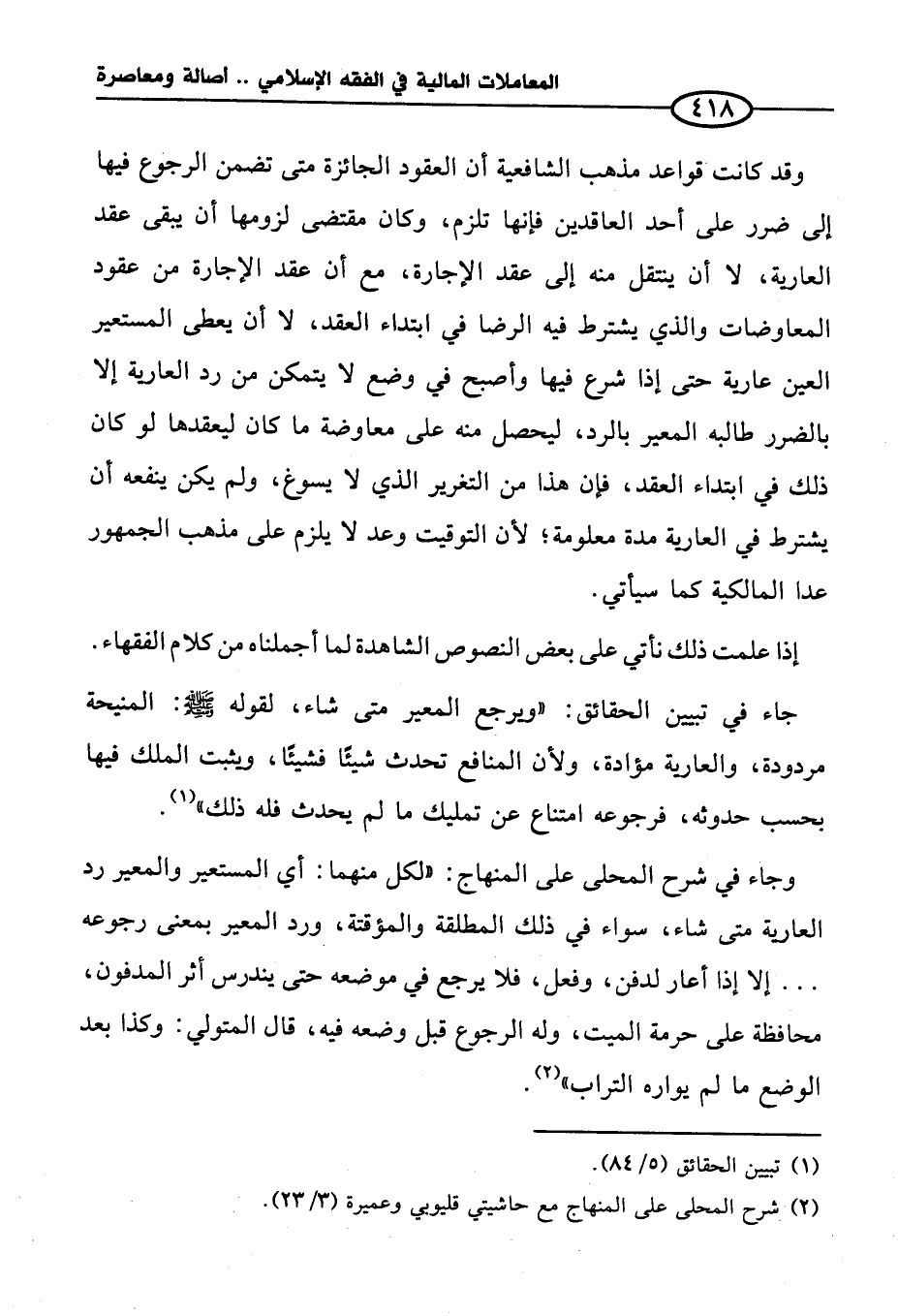 وقد كانت قواعد مذهب الشافعية أن العقود الجائزة متى تضمن الرجوع فيها إلى ضرر على أحد العاقدين فإنها تلزم، وكان مقتضى لزومها أن يبقى عقد العارية، لا أن ينتقل منه إلى عقد الإجارة، مع أن عقد الإجارة من عقود المعاوضات والذي يشترط فيه الرضا في ابتداء العقد، لا أن يعطى المستعير العين عارية حتى إذا شرع فيها وأصبح في وضع لا يتمكن من رد العارية إلا بالضرر طالبه المعير بالرد، ليحصل منه على معاوضة ما كان ليعقدها لو كان ذلك في ابتداء العقد، فإن هذا من التغرير الذي لا يسوغ، ولم يكن ينفعه أن يشترط في العارية مدة معلومة، لأن التوقيت وعد لا يلزم على مذهب الجمهور عدا المالكية كما سيأتي.