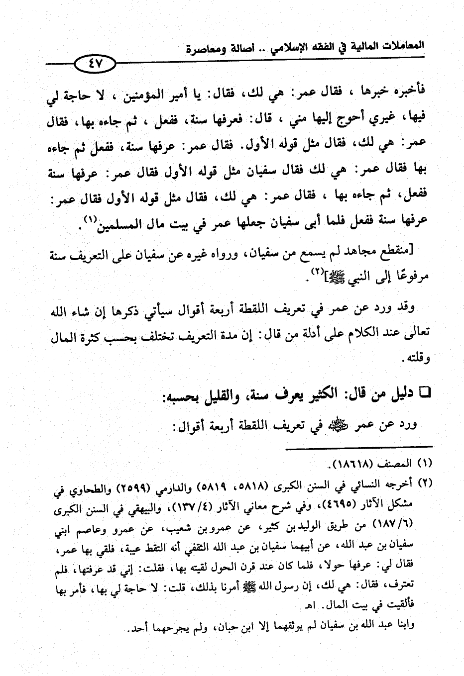 (¬٢) أخرجه النسائي في السنن الكبرى (٥٨١٨، ٥٨١٩) والدارمي (٢٥٩٩) والطحاوي في مشكل الآثار (٤٦٩٥)، وفي شرح معاني الآثار (٤/ ١٣٧)، والبيهقي في السنن الكبرى (٦/ ١٨٧) من طريق الوليد بن كثير، عن عمرو بن شعيب، عن عمرو وعاصم ابني سفيان بن عبد الله، عن أبيهما سفيان بن عبد الله الثقفي أنه التقط عيبة، فلقي بها عمر، فقال لي: عرفها حولًا, فلما كان عند قرن الحول لقيته بها، فقلت: إني قد عرفتها، فلم تعترف، فقال: هي لك، إن رسول الله - صلى الله عليه وسلم - أمرنا بذلك، قلت: لا حاجة لي بها، فأمر بها فألقيت في بيت المال. اهـ.