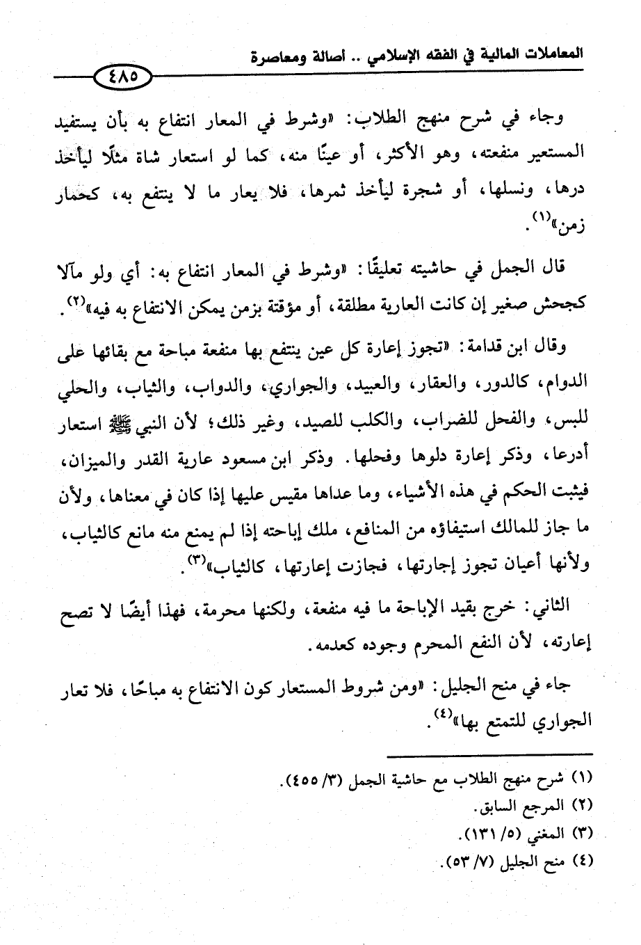 قال الجمل في حاشيته تعليقًا: "وشرط في المعار انتفاع به: أي ولو مآلا كجحش صغير إن كانت العارية مطلقة، أو مؤقتة بزمن يمكن الانتفاع به فيه" (¬٢).