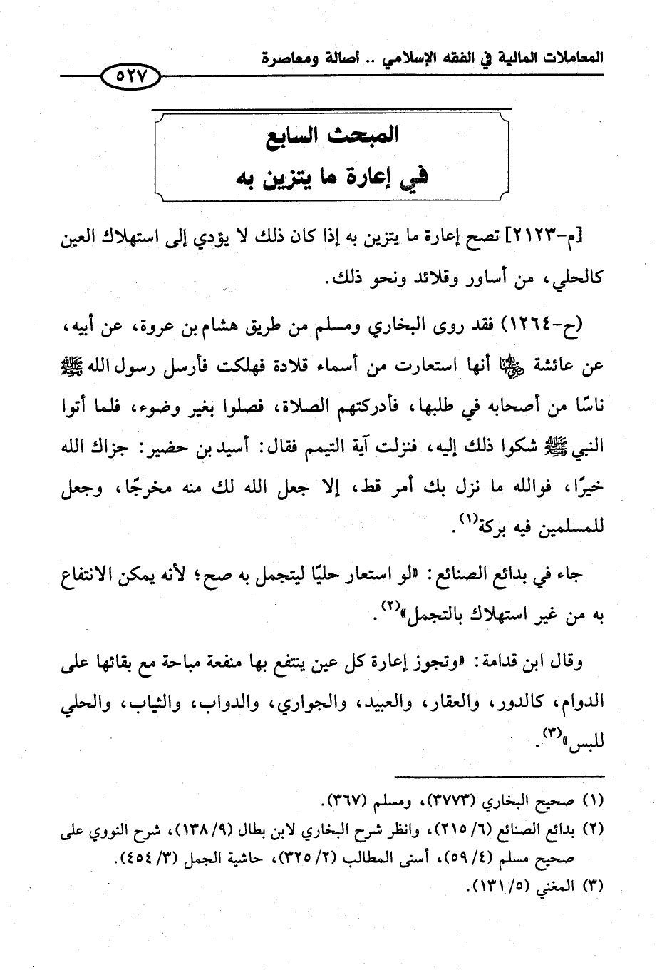 [م - ٢١٢٣] تصح إعارة ما يتزين به إذا كان ذلك لا يؤدي إلى استهلاك العين كالحلي، من أساور وقلائد ونحو ذلك.