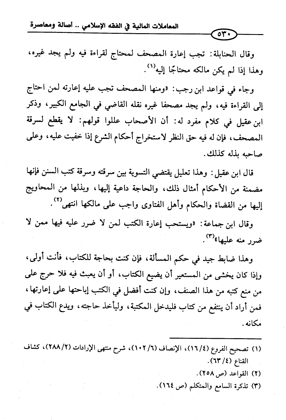 وجاء في قواعد ابن رجب: "ومنها المصحف تجب عليه إعارته لمن احتاج إلى القراءة فيه، ولم يجد مصحفًا غيره نقله القاضي في الجامع الكبير، وذكر ابن عقيل في كلام مفرد له: أن الأصحاب عللوا قولهم: لا يقطع لسرقة المصحف، فإن له فيه حق النظر لاستخراج أحكام الشرع إذا خفيت عليه، وعلى صاحبه بذله كذلك.