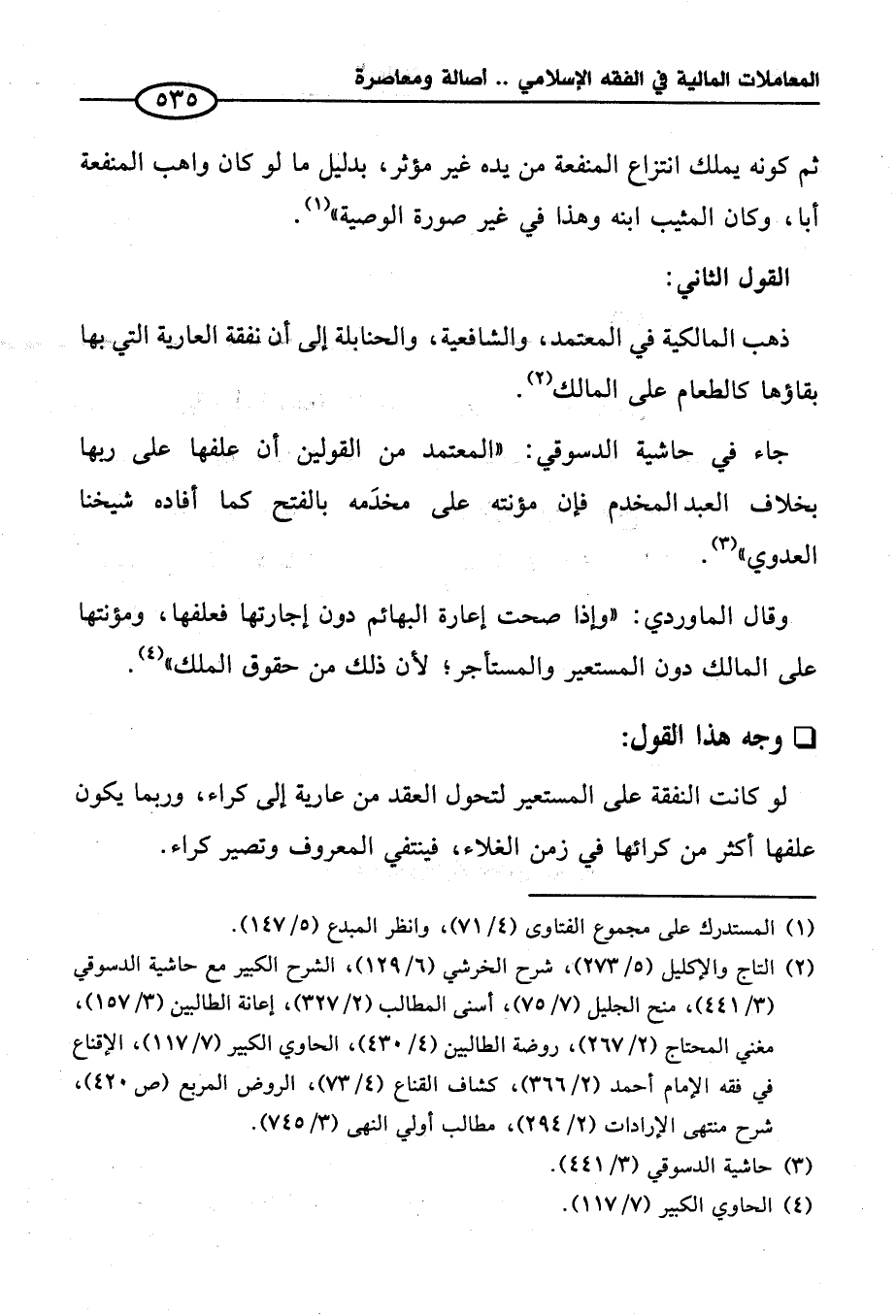 وقال الماوردي: "وإذا صحت إعارة البهائم دون إجارتها فعلفها، ومؤنتها على المالك دون المستعير والمستأجر؛ لأن ذلك من حقوق الملك" (¬٤).