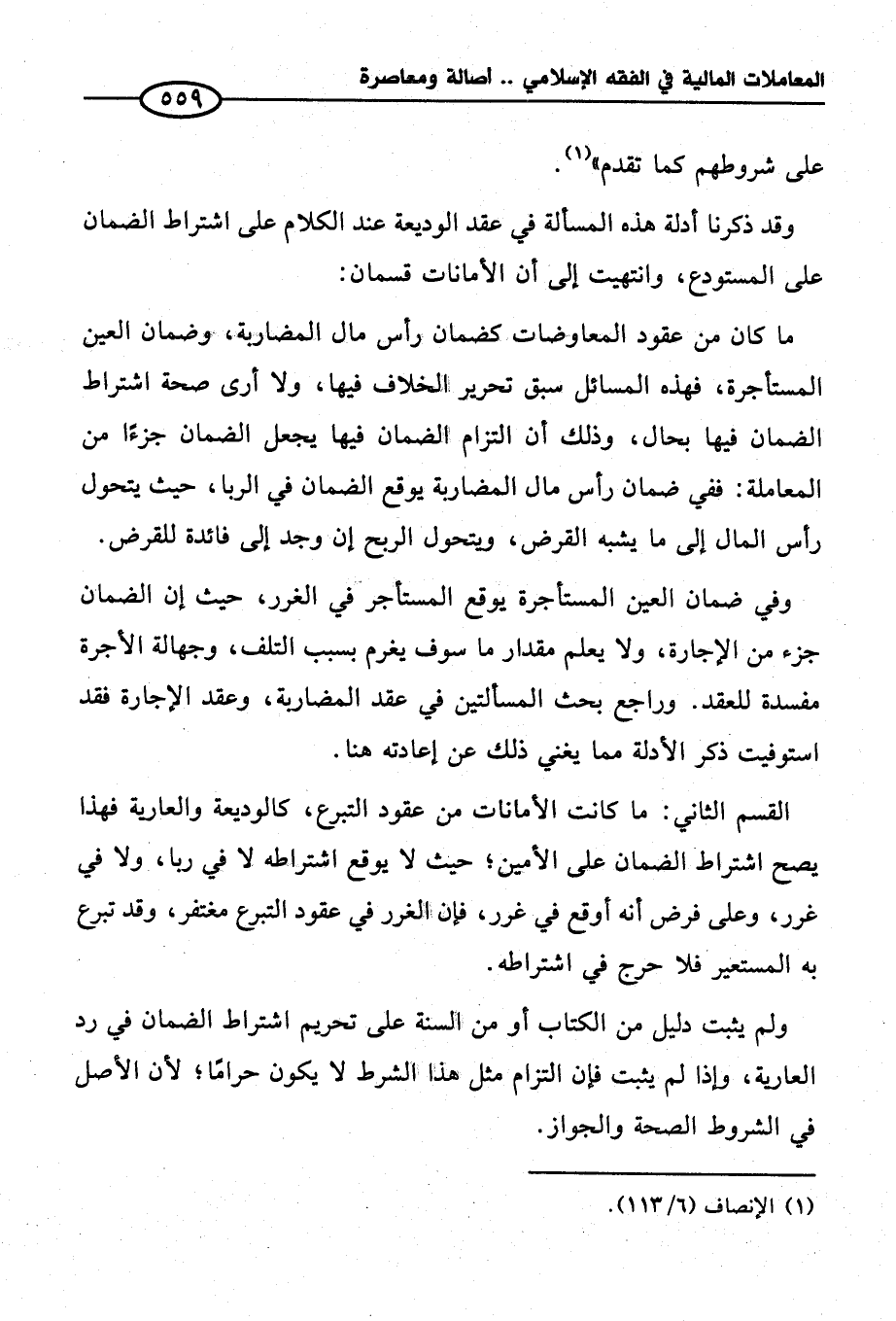 ولم يثبت دليل من الكتاب أو من السنة على تحريم اشتراط الضمان في رد العارية، وإذا لم يثبت فإن التزام مثل هذا الشرط لا يكون حرامًا؛ لأن الأصل في الشروط الصحة والجواز.