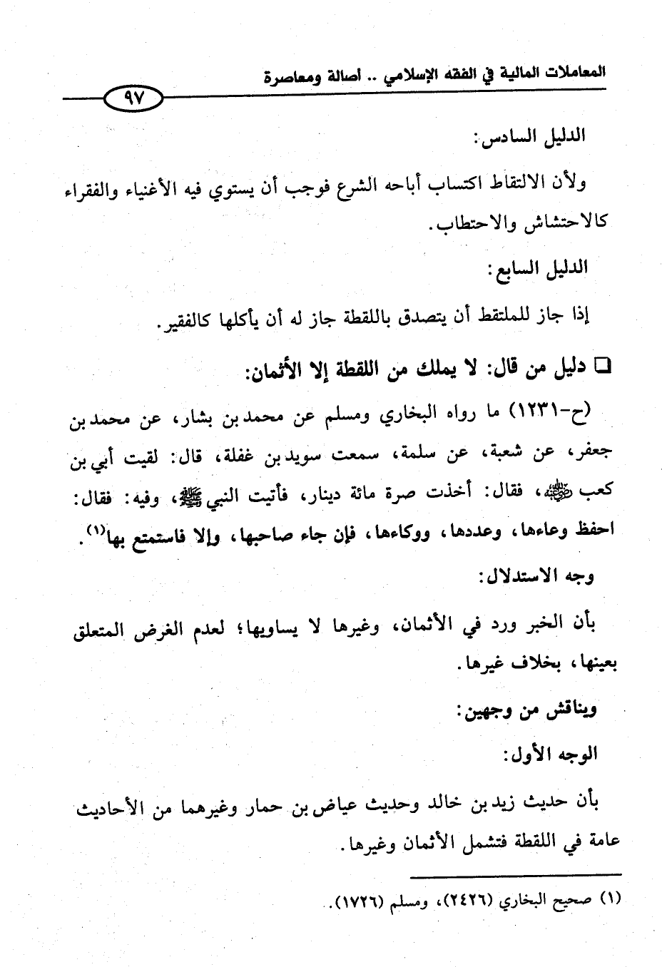 (ح - ١٢٣١) ما رواه البخاري ومسلم عن محمد بن بشار، عن محمد بن جعفر، عن شعبة، عن سلمة، سمعت سويد بن غفلة، قال: لقيت أبي بن كعب - رضي الله عنه -، فقال: أخذت صرة مائة دينار، فأتيت النبي - صلى الله عليه وسلم -، وفيه: فقال: احفظ وعاءها، وعددها، ووكائها، فإن جاء صاحبها، وإلا فاستمتع بها (¬١).