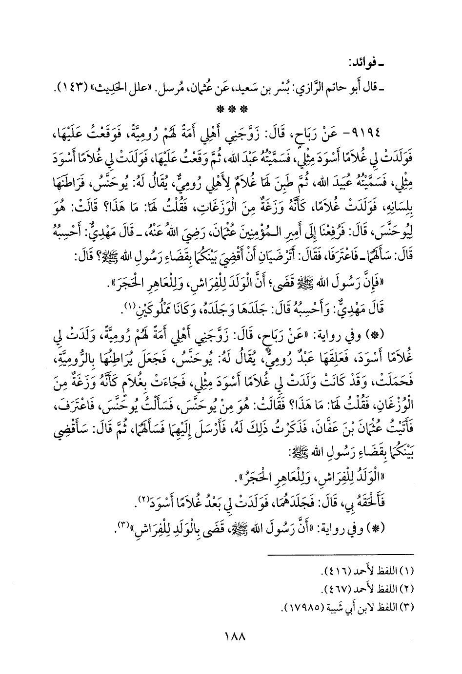 ٩١٩٤ - عن رباح، قال: زوجني أهلي أمة لهم رومية، فوقعت عليها، فولدت لي غلاما أسود مثلي، فسميته عبد الله، ثم وقعت عليها، فولدت لي غلاما أسود مثلي، فسميته عُبيد الله، ثم طبن لها غلام لأهلي رومي، يقال له: يوحنس، فراطنها بلسانه، فولدت غلاما، كأنه وزغة من الوزغات، فقلت لها: ما هذا؟ قالت: هو ليوحنس، قال: فرفعنا إلى أمير المؤمنين عثمان، رضي الله عنه، ـ قال مهدي: أحسبه قال: سألهما ـ فاعترفا، فقال: أترضيان أن أقضي بينكما بقضاء رسول الله صَلى الله عَليه وسَلم؟ قال: