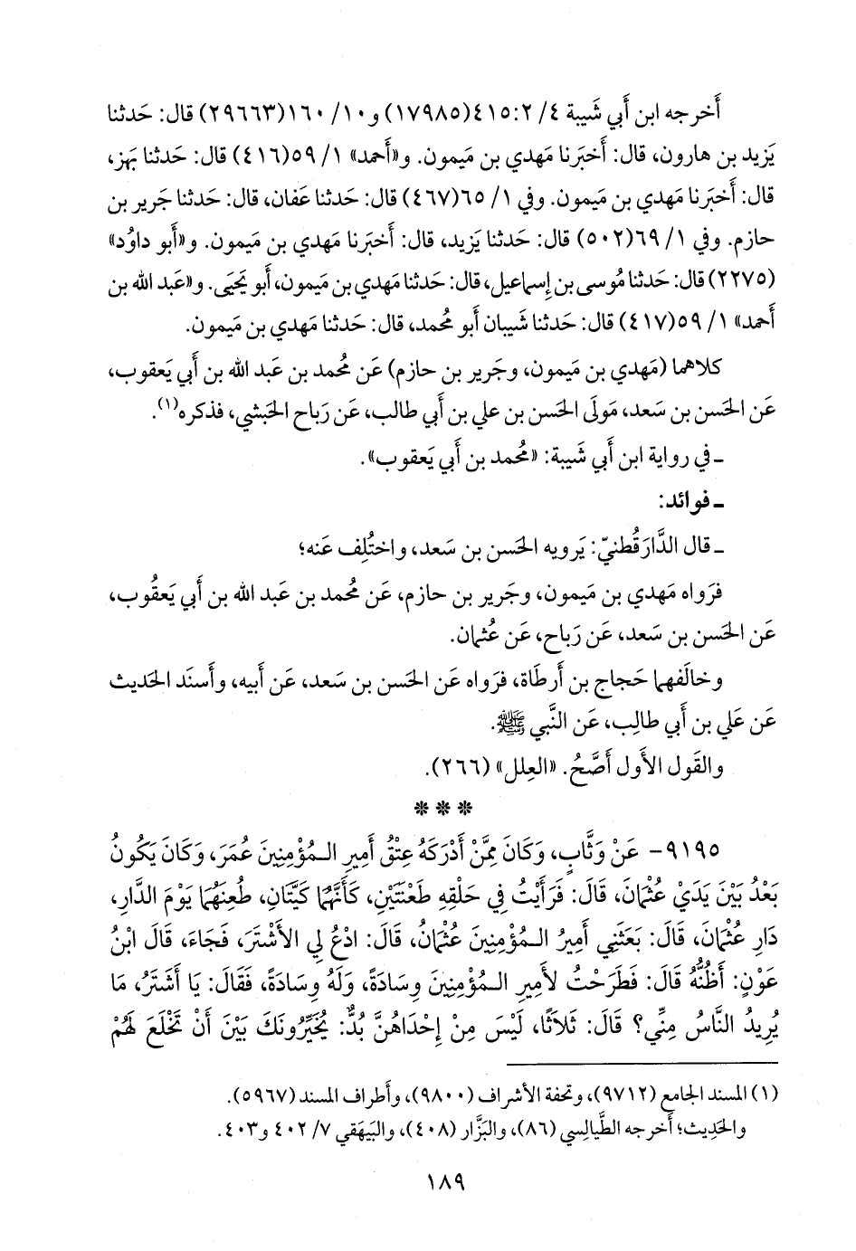 - وقال الدارقُطني أيضا: قال علي بن المديني: حدثنا يحيى بن سعيد، عن مهدي بن ميمون، عن ابن أبي يعقوب، عن رباح، عن عثمان، عن النبي صَلى الله عَليه وسَلم؛ قصة الولد للفراش.