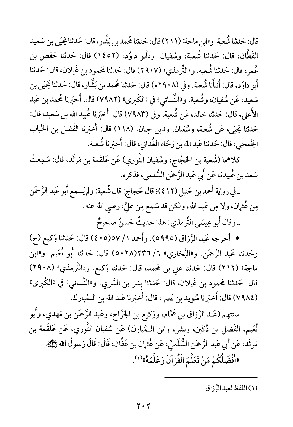 ستتهم (عبد الرزاق بن همام، ووكيع بن الجراح، وعبد الرَّحمَن بن مهدي، وأَبو نُعيم الفضل بن دُكَين، وبشر، وابن المبارك) عن سفيان الثوري، عن علقمة بن مَرثد، عن أبي عبد الرَّحمَن السُّلَمي، عن عثمان بن عفان، قال: قال رسول الله صَلى الله عَليه وسَلم: