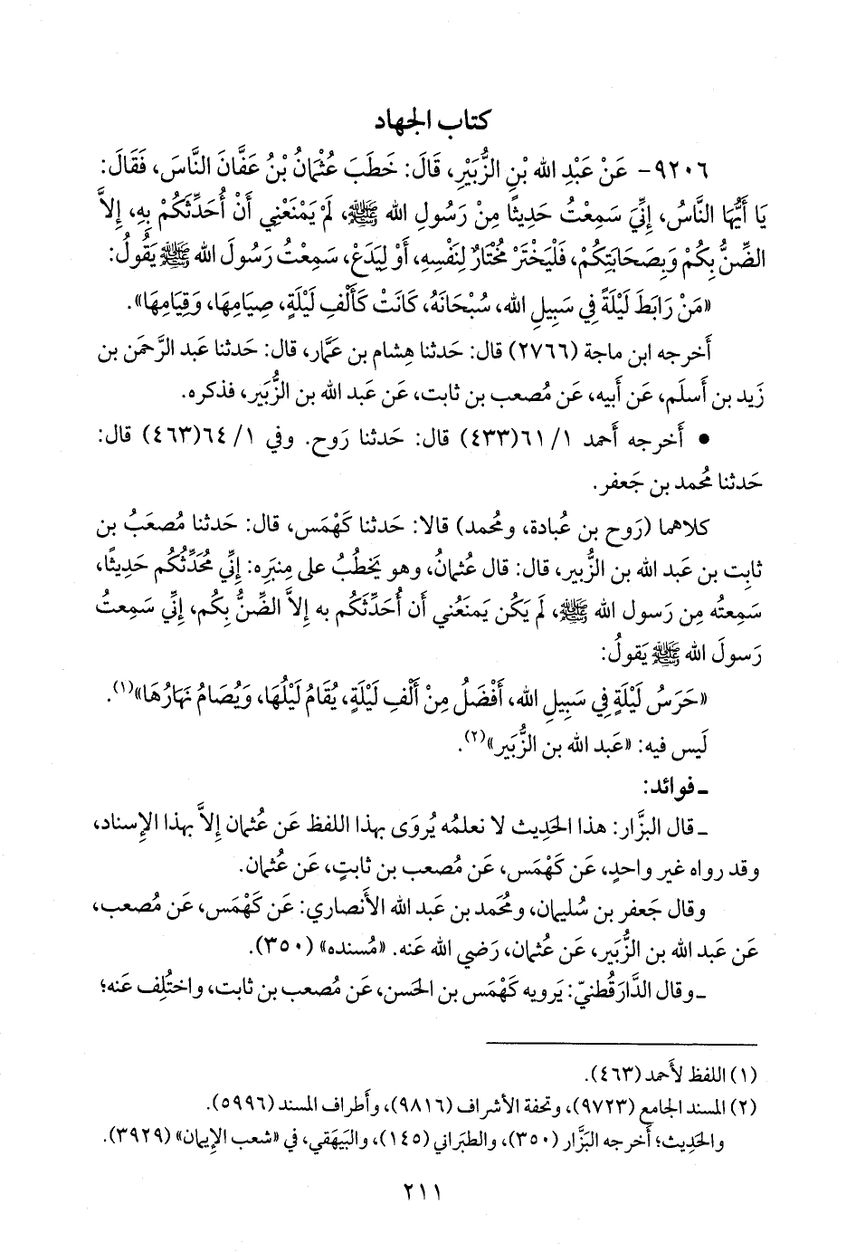 ٩٢٠٦ - عن عبد الله بن الزبير، قال: خطب عثمان بن عفان الناس، فقال: يا أيها الناس، إني سمعت حديثا من رسول الله صَلى الله عَليه وسَلم لم يمنعني أن أحدثكم به، إلا الضن بكم وبصحابتكم، فليختر مختار لنفسه، أو ليدع، سمعت رسول الله صَلى الله عَليه وسَلم يقول: