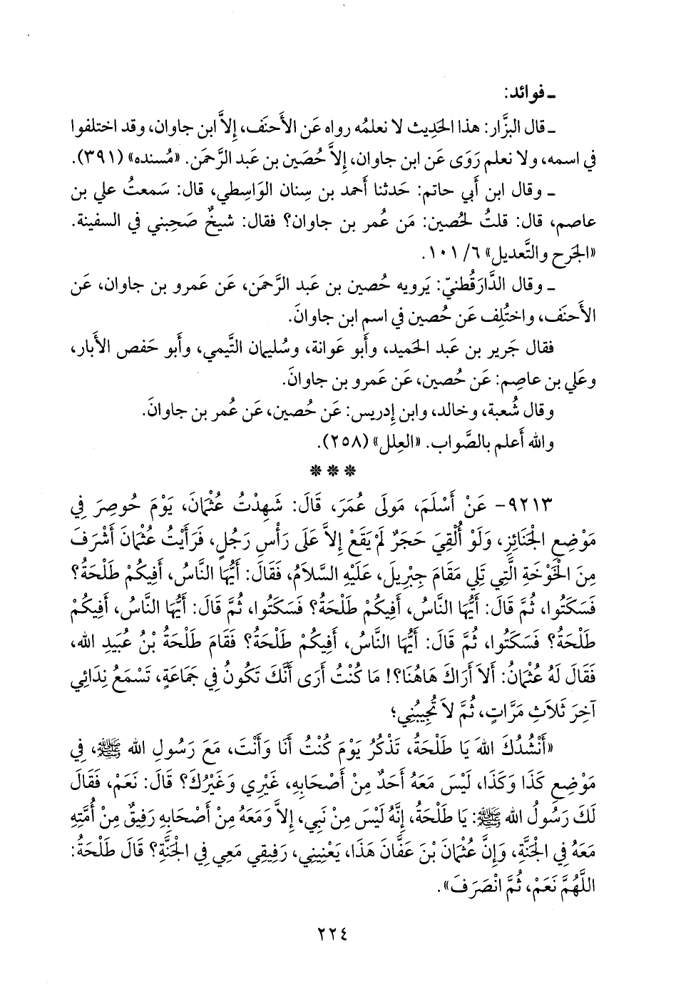 «أنشدك الله يا طلحة، تذكر يوم كنت أنا وأنت، مع رسول الله صَلى الله عَليه وسَلم في موضع كذا وكذا، ليس معه أحد من أصحابه، غيري وغيرك؟ قال: نعم، فقال لك رسول الله صَلى الله عَليه وسَلم: يا طلحة، إنه ليس من نبي، إلا ومعه من أصحابه رفيق من أمته معه في الجنة، وإن عثمان بن عفان هذا, يعنيني, رفيقي معي في الجنة؟ قال طلحة: اللهم نعم، ثم انصرف».