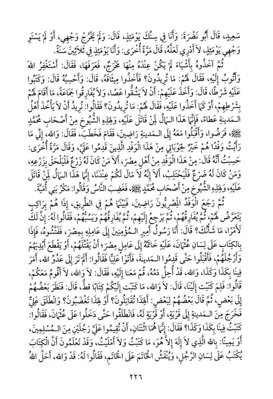 ثم آخذوه بأشياء لم يكن عنده منها مخرج، فعرفها، فقال: أستغفر الله وأتوب إليه، فقال لهم: ما تريدون؟ فأخذوا ميثاقه، قال: وأحسبه قال: وكتبوا عليه شرطا، قال: وأخذ عليهم: أن لا يشقوا عصا، ولا يفارقوا جماعة، ما أقام لهم بشرطهم، أو كما أخذوا عليه، فقال لهم: ما تريدون؟ فقالوا: نريد أن لا يأخذ أهل المدينة عطاء، فإنما هذا المال لمن قاتل عليه، ولهذه الشيوخ من أصحاب محمد صَلى الله عَليه وسَلم فرضوا، وأقبلوا معه إلى المدينة راضين، فقام فخطب، فقال: والله، إني ما رأيت وفدا هم خير لحوباتي من هذا الوفد الذين قدموا علي، وقال مرة أخرى: حَسِبتُ أنه قال: من هذا الوفد من أهل مصر، ألا من كان له زرع فليلحق بزرعه، ومن كان له ضرع فليحتلب، ألا إنه لا مال لكم عندنا، إنما هذا المال لمن قاتل عليه، ولهذه الشيوخ من أصحاب محمد صَلى الله عَليه وسَلم فغضب الناس وقالوا: مكر بني أمية.