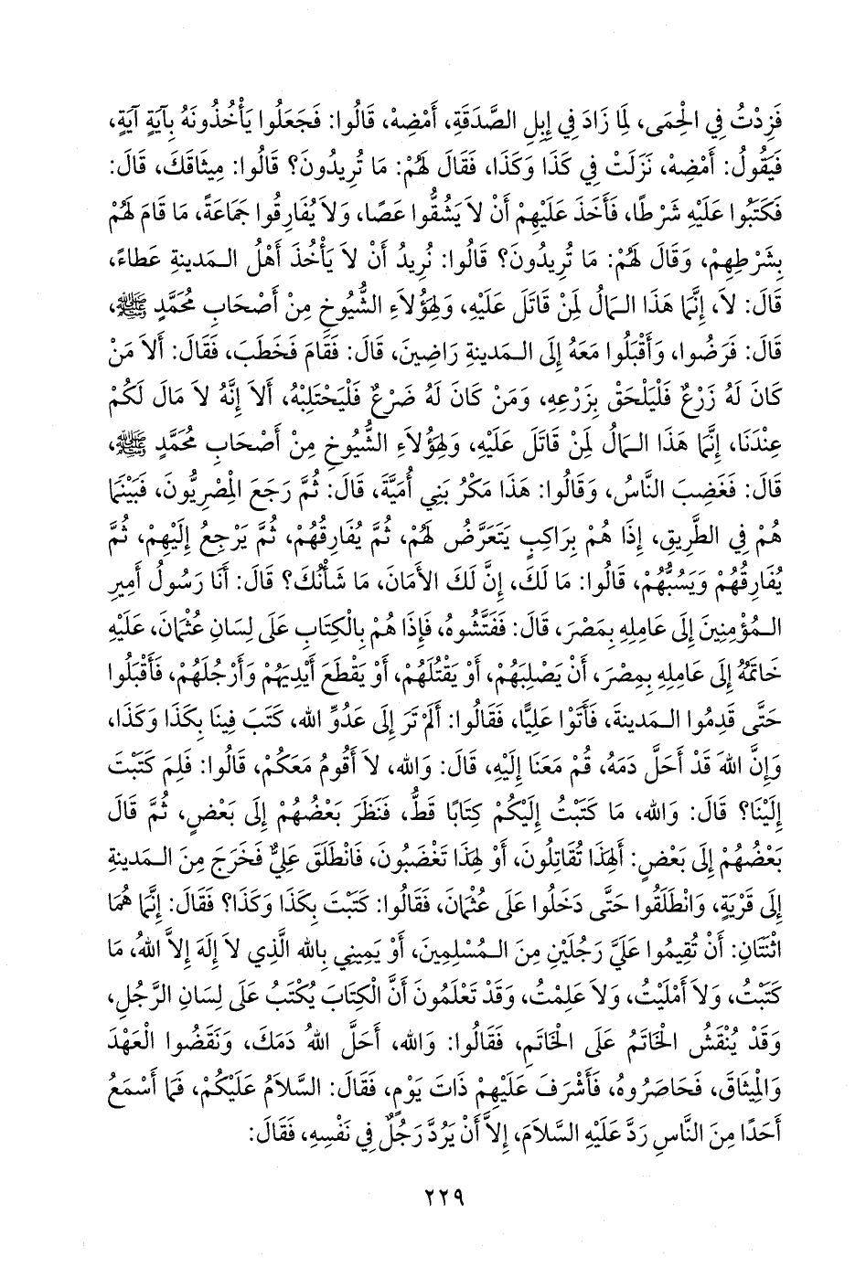 قال: لا، إنما هذا المال لمن قاتل عليه، ولهؤلاء الشيوخ من أصحاب محمد صَلى الله عَليه وسَلم قال: فرضوا، وأقبلوا معه إلى المدينة راضين، قال: فقام فخطب، فقال: ألا من كان له زرع فليلحق بزرعه، ومن كان له ضرع فليحتلبه، ألا إنه لا مال لكم عندنا، إنما هذا المال لمن قاتل عليه، ولهؤلاء الشيوخ من أصحاب محمد صَلى الله عَليه وسَلم قال: فغضب الناس، وقالوا: هذا مكر بني أمية، قال: ثم رجع المصريون، فبينما هم في الطريق، إذا هم براكب يتعرض لهم، ثم يفارقهم، ثم يرجع إليهم، ثم يفارقهم ويسبهم، قالوا: ما لك، إن لك الأمان، ما شأنك؟ قال: أنا رسول أمير المؤمنين إلى عامله بمصر، قال: ففتشوه، فإذا هم بالكتاب على لسان عثمان، عليه خاتمه إلى عامله بمصر، أن يصلبهم، أو يقتلهم، أو يقطع أيديهم وأرجلهم، فأقبلوا حتى قدموا المدينة، فأتوا عليا، فقالوا: ألم تر إلى عدو الله، كتب فينا بكذا وكذا، وإن الله قد أحل دمه، قم معنا إليه، قال: والله، لا أقوم معكم، قالوا: فلم كتبت إلينا؟ قال: والله، ما كتبت إليكم كتابا قط، فنظر بعضهم إلى بعض، ثم قال بعضهم إلى بعض: ألهذا تقاتلون، أو لهذا تغضبون، فانطلق علي فخرج من المدينة إلى قرية، وانطلقوا حتى دخلوا على عثمان، فقالوا: كتبت بكذا وكذا؟ فقال: إنما هما اثنتان: أن تقيموا علي رجلين من المسلمين، أو يميني بالله الذي لا إله إلا الله، ما كتبت، ولا أمليت، ولا علمت، وقد تعلمون أن الكتاب يكتب على لسان الرجل، وقد ينقش الخاتم على الخاتم، فقالوا: والله، أحل الله دمك، ونقضوا العهد والميثاق، فحاصروه، فأشرف عليهم ذات يوم، فقال: السلام عليكم، فما أسمع أحدا من الناس رد عليه السلام، إلا أن يرد رجل في نفسه، فقال: