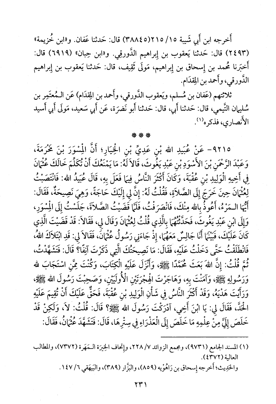 ٩٢١٥ - عن عُبيد الله بن عَدي بن الخيار؛ أن المسور بن مخرمة، وعبد الرَّحمَن بن الأسود بن عبد يغوث، قالا له: ما يمنعك أن تكلم خالك عثمان في أخيه الوليد بن عُقبة، وكان أكثر الناس فيما فعل به، قال عُبيد الله: فانتصبت لعثمان حين خرج إلى الصلاة، فقلت له: إن لي إليك حاجة، وهي نصيحة، فقال: أيها المرء، أعوذ بالله منك، فانصرفت، فلما قضيت الصلاة، جلست إلى المسور، وإلى ابن عبد يغوث، فحدثتهما بالذي قلت لعثمان وقال لي، فقالا: قد قضيت الذي كان عليك، فبينما أنا جالس معهما، إذ جاءني رسول عثمان، فقالا لي: قد ابتلاك الله، فانطلقت حتى دخلت عليه، فقال: ما نصيحتك التي ذكرت آنفا؟ قال: فتشهدت، ثم قلت: إن الله بعث محمدا صَلى الله عَليه وسَلم وأنزل عليه الكتاب، وكنت ممن استجاب لله ورسوله صَلى الله عَليه وسَلم وآمنت به، وهاجرت الهجرتين الأوليين، وصحبت رسول الله صَلى الله عَليه وسَلم ورأيت هديه، وقد أكثر الناس في شأن الوليد بن عُقبة، فحق عليك أن تقيم عليه الحد، فقال لي: يا ابن أخي، آدركت رسول الله صَلى الله عَليه وسَلم؟ قال: قلت: لا، ولكن قد خلص إلي من علمه ما خلص إلى العذراء في سترها، قال: فتشهد عثمان، فقال: