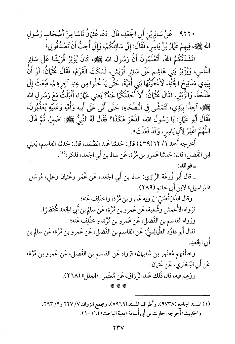 ٩٢٢٠ - عن سالم بن أبي الجعد، قال: دعا عثمان ناسا من أصحاب رسول الله صَلى الله عَليه وسَلم فيهم عمار بن ياسر، فقال: إني سائلكم، وإني أحب أن تصدقوني؛