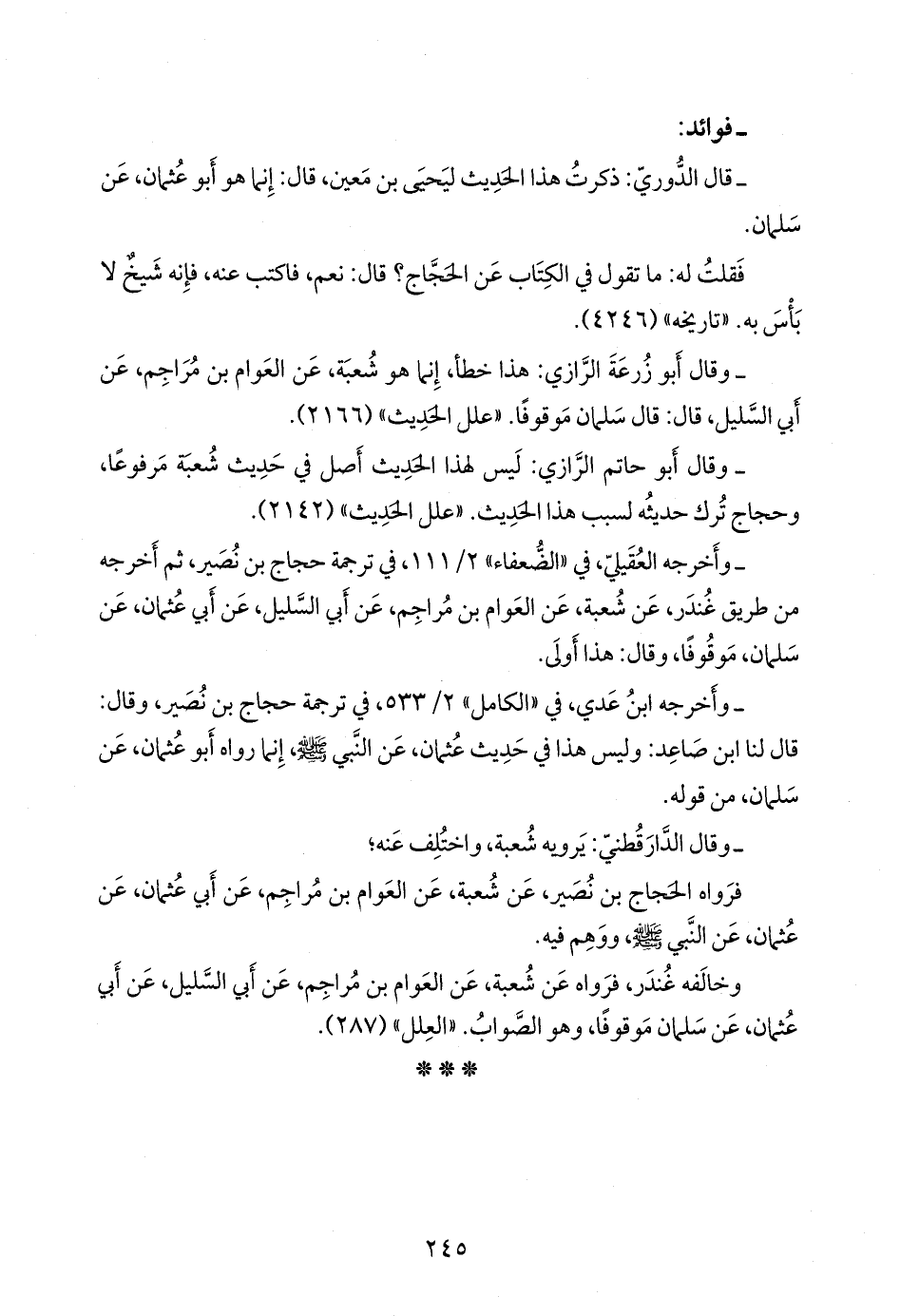 - وقال أَبو زُرعَة الرازي: هذا خطأ إنما هو شعبة، عن العوام بن مراجم، عن أبي السليل، قال: قال سلمان موقوفا. «علل الحديث» (٢١٦٦).