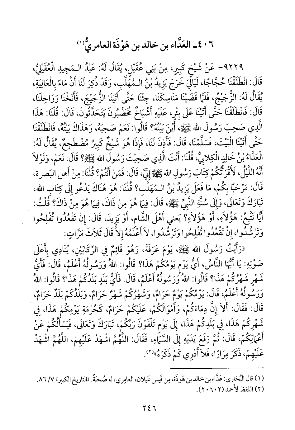 ٩٢٢٩ - عن شيخ كبير، من بني عقيل، يقال له: عبد المجيد العُقيلي، قال: انطلقنا حجاجا، ليالي خرج يزيد بن المهلب، وقد ذكر لنا أن ماء بالعالية، يقال له: الزجيج، فلما قضينا مناسكنا، جئنا حتى أتينا الزجيج، فأنخنا رواحلنا، قال: فانطلقنا حتى أتينا على بئر، عليه أشياخ مخضبون يتحدثون، قال: قلنا: هذا الذي صحب رسول الله صَلى الله عَليه وسَلم أين بيته؟ قالوا: نعم صحبه، وهذاك بيته، فانطلقنا حتى أتينا البيت، فسلمنا، قال: فأذن لنا، فإذا هو شيخ كبير مضطجع، يقال له: العداء بن خالد الكلابي، قلنا: أنت الذي صحبت رسول الله صَلى الله عَليه وسَلم؟ قال: نعم، ولولا أنه الليل، لأقرأتكم كتاب رسول الله صَلى الله عَليه وسَلم إلي، قال: فمن أنتم؟ قلنا: من أهل البصرة، قال: مرحبا بكم، ما فعل يزيد بن المهلب؟ قلنا: هو هناك يدعو إلى كتاب الله، تبارك وتعالى، وإلى سنة النبي صَلى الله عَليه وسَلم قال: فيما هو من ذاك، فيما هو من ذاك؟ قلت: أيا نتبع: هؤلاء، أو هؤلاء؟ يعني أهل الشام، أو يزيد، قال: إن تقعدوا تفلحوا وترشدوا، إن تقعدوا تفلحوا وترشدوا، لا أعلمه إلا قال ثلاث مرات: