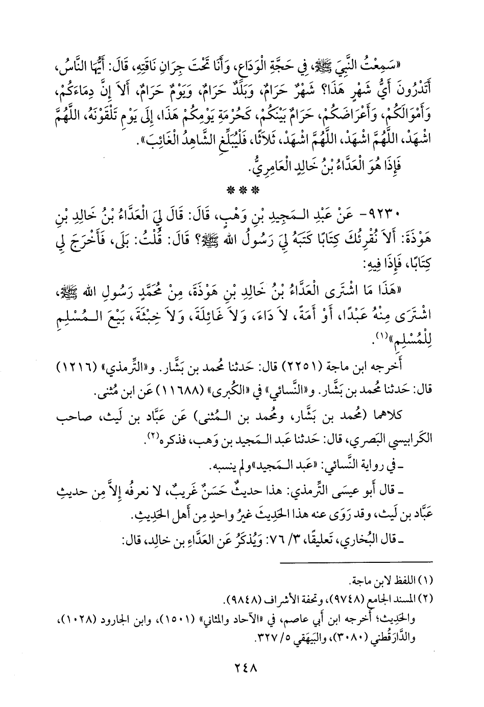 ٩٢٣٠ - عن عبد المجيد بن وهب، قال: قال لي العداء بن خالد بن هوذة: ألا نقرئك كتابا كتبه لي رسول الله صَلى الله عَليه وسَلم؟ قال: قلت: بلى، فأخرج لي كتابا، فإذا فيه: