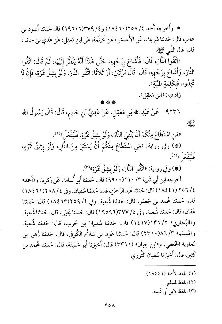 ٩٢٣٦ - عن عبد الله بن معقل، عن عَدي بن حاتم، قال: قال رسول الله صَلى الله عَليه وسَلم: