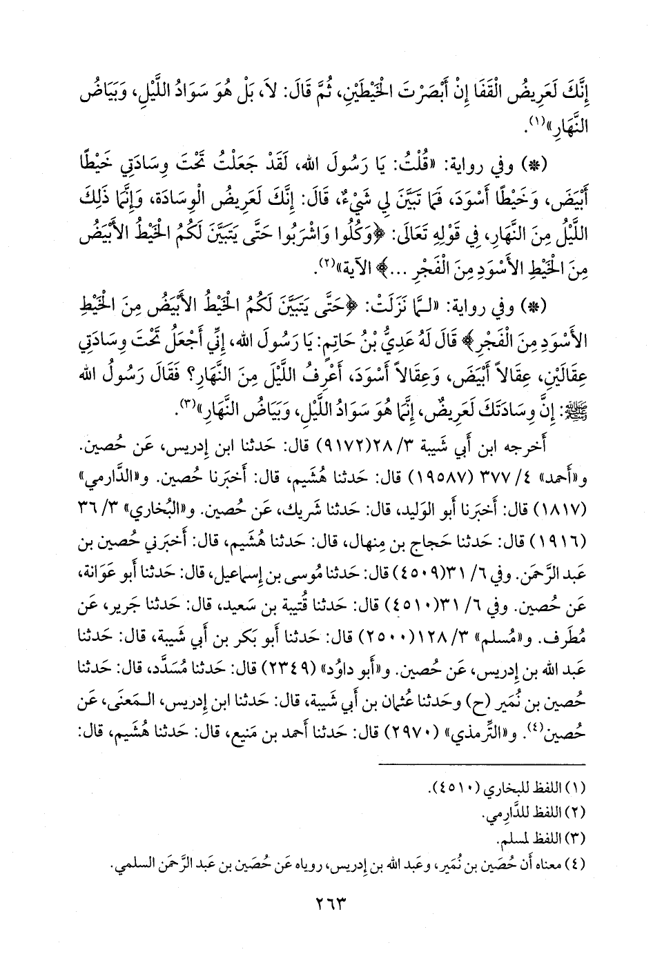 - وفي رواية: «قلت: يا رسول الله، لقد جعلت تحت وسادتي خيطا أبيض، وخيطا أسود، فما تبين لي شيء، قال: إنك لعريض الوسادة، وإنما ذلك الليل من النهار، في قوله تعالى: {وكلوا واشربوا حتى يتبين لكم الخيط الأبيض من الخيط الأسود من الفجر ... } الآية» (¬١).