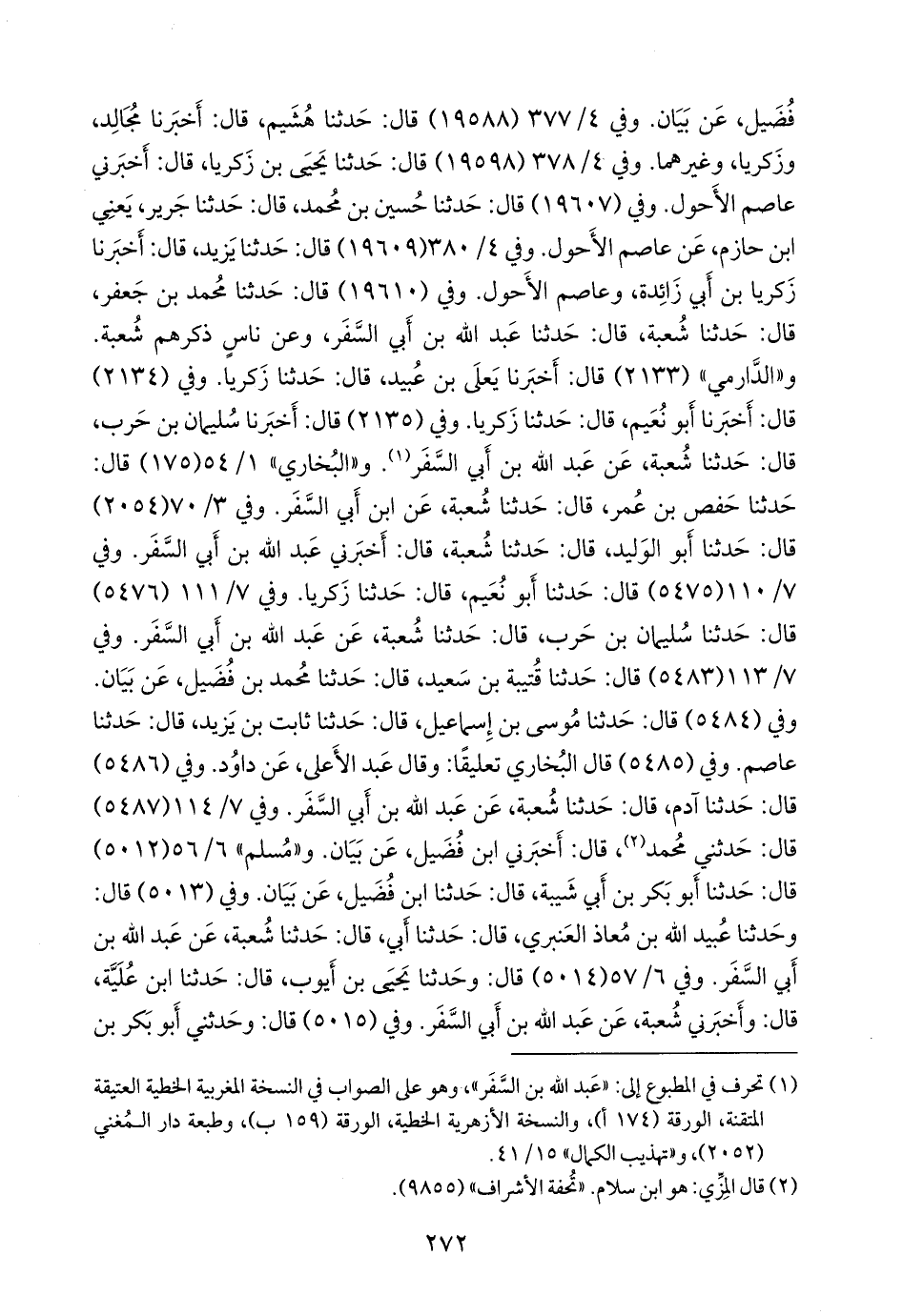 وفي (٢١٣٤) قال: أخبرنا أَبو نُعيم، قال: حدثنا زكريا. وفي (٢١٣٥) قال: أخبرنا سليمان بن حرب، قال: حدثنا شعبة، عن عبد الله بن أبي السفر (¬١). و «البخاري» ١/ ٤٦ (١٧٥) قال: حدثنا حفص بن عمر، قال: حدثنا شعبة، عن ابن أبي السفر. وفي ٣/ ٥٤ (٢٠٥٤) قال: حدثنا أَبو الوليد، قال: حدثنا شعبة، قال: أخبرني عبد الله بن أبي السفر. وفي ٧/ ٨٥ (٥٤٧٥) قال: حدثنا أَبو نُعيم، قال: حدثنا زكريا. وفي ٧/ ٨٦ (٥٤٧٦) قال: حدثنا سليمان بن حرب، قال: حدثنا شعبة، عن عبد الله بن أبي السفر. وفي ٧/ ٨٧ (٥٤٨٣) قال: حدثنا قتيبة بن سعيد، قال: حدثنا محمد بن فضيل، عن بيان. وفي (٥٤٨٤) قال: حدثنا موسى بن إسماعيل، قال: حدثنا ثابت بن يزيد، قال: حدثنا عاصم. وفي (٥٤٨٥) قال البخاري تعليقا: وقال عبد الأعلى، عن داود. وفي (٥٤٨٦) قال: حدثنا آدم، قال: حدثنا شعبة، عن عبد الله بن أبي السفر. وفي ٧/ ٨٨ (٥٤٨٧) قال: حدثني محمد (¬٢)، قال: أخبرني ابن فضيل، عن بيان. و «مسلم» ٦/ ٥٦ (٥٠١٢) قال: حدثنا أَبو بكر بن أبي شيبة، قال: حدثنا ابن فضيل، عن بيان. وفي (٥٠١٣) قال: وحدثنا عُبيد الله بن معاذ العنبري، قال: حدثنا أبي، قال: حدثنا شعبة، عن عبد الله بن أبي السفر. وفي ٦/ ٥٧ (٥٠١٤) قال: وحدثنا يحيى بن أيوب، قال: حدثنا ابن عُلَية، قال: وأخبرني شعبة، عن عبد الله بن أبي السفر. وفي (٥٠١٥) قال: وحدثني أَبو بكر بن