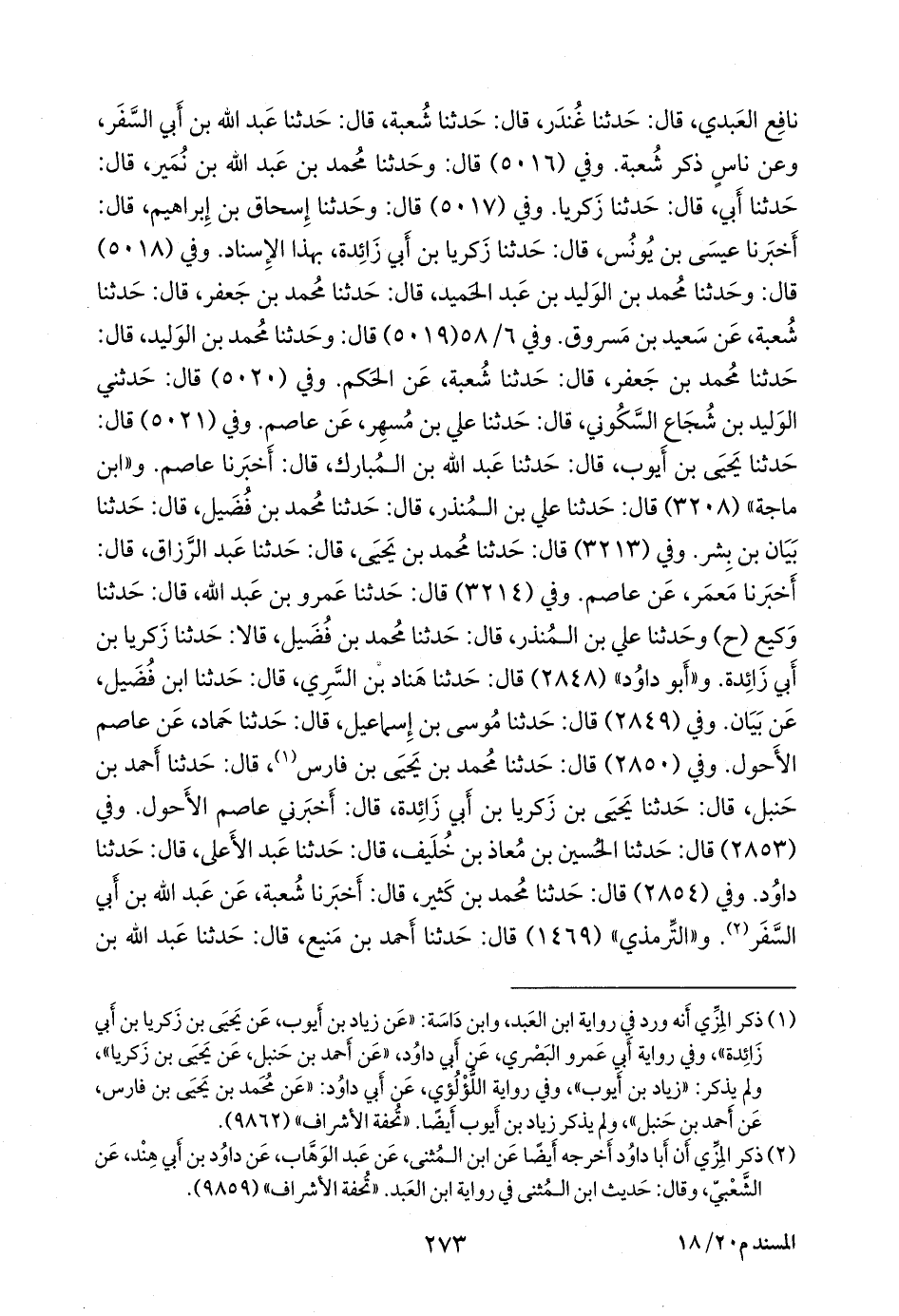 وفي (٥٠١٨) قال: وحدثنا محمد بن الوليد بن عبد الحميد، قال: حدثنا محمد بن جعفر، قال: حدثنا شعبة، عن سعيد بن مسروق. وفي ٦/ ٥٨ (٥٠١٩) قال: وحدثنا محمد بن الوليد، قال: حدثنا محمد بن جعفر، قال: حدثنا شعبة، عن الحكم. وفي (٥٠٢٠) قال: حدثني الوليد بن شجاع السَّكوني، قال: حدثنا علي بن مُسهِر، عن عاصم. وفي (٥٠٢١) قال: حدثنا يحيى بن أيوب، قال: حدثنا عبد الله بن المبارك، قال: أخبرنا عاصم. و «ابن ماجة» (٣٢٠٨) قال: حدثنا علي بن المنذر، قال: حدثنا محمد بن فضيل، قال: حدثنا بيان بن بشر. وفي (٣٢١٣) قال: حدثنا محمد بن يحيى، قال: حدثنا عبد الرزاق، قال: أخبرنا مَعمَر، عن عاصم. وفي (٣٢١٤) قال: حدثنا عَمرو بن عبد الله، قال: حدثنا وكيع (ح) وحدثنا علي بن المنذر، قال: حدثنا محمد بن فضيل، قالا: حدثنا زكريا بن أبي زائدة. و «أَبو داود» (٢٨٤٨) قال: حدثنا هَنَّاد بن السَّري، قال: حدثنا ابن فضيل، عن بيان. وفي (٢٨٤٩) قال: حدثنا موسى بن إسماعيل، قال: حدثنا حماد، عن عاصم الأحول. وفي (٢٨٥٠) قال: حدثنا محمد بن يحيى بن فارس (¬١)، قال: حدثنا أحمد بن حنبل، قال: حدثنا يحيى بن زكريا بن أبي زائدة، قال: أخبرني عاصم الأحول. وفي (٢٨٥٣) قال: حدثنا الحسين بن معاذ بن خليف، قال: حدثنا عبد الأعلى، قال: حدثنا داود. وفي (٢٨٥٤) قال: حدثنا محمد بن كثير، قال: أخبرنا شعبة، عن عبد الله بن أبي السفر (¬٢). و «التِّرمِذي» (١٤٦٩) قال: حدثنا أحمد بن مَنيع، قال: حدثنا عبد الله بن