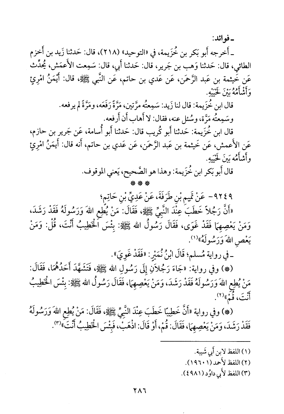 - وفي رواية: «أن خطيبا خطب عند النبي صَلى الله عَليه وسَلم فقال: من يطع الله ورسوله فقد رشد، ومن يعصهما، فقال: قم، أو قال: اذهب، فبئس الخطيب أنت» (¬٣).