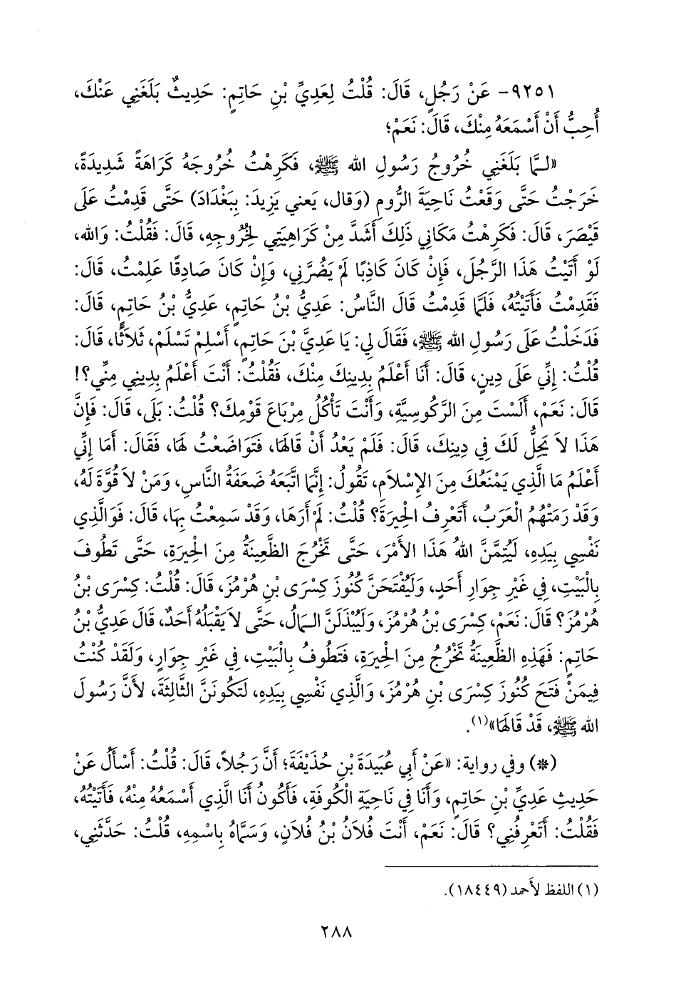 «لما بلغني خروج رسول الله صَلى الله عَليه وسَلم فكرهت خروجه كراهة شديدة، خرجت حتى وقعت ناحية الروم (وقال، يعني يزيد: ببغداد) حتى قدمت على قيصر، قال: فكرهت مكاني ذلك أشد من كراهيتي لخروجه، قال: فقلت: والله، لو أتيت هذا الرجل، فإن كان كاذبا لم يضرني، وإن كان صادقا علمت، قال: فقدمت فأتيته، فلما قدمت قال الناس: عَدي بن حاتم، عَدي بن حاتم، قال: فدخلت على رسول الله صَلى الله عَليه وسَلم فقال لي: يا عَدي بن حاتم، أسلم تسلم، ثلاثا، قال: قلت: إني على دين، قال: أنا أعلم بدينك منك، فقلت: أنت أعلم بديني مني؟! قال: نعم، ألست من الركوسية، وأنت تأكل مرباع قومك؟ قلت: بلى، قال: فإن هذا لا يحل لك في دينك، قال: فلم يعد أن قالها، فتواضعت لها، فقال: أما إني أعلم ما الذي يمنعك من الإسلام، تقول: إنما اتبعه ضعفة الناس، ومن لا قوة له، وقد رمتهم العرب، أتعرف الحيرة؟ قلت: لم أرها، وقد سمعت بها، قال: فوالذي نفسي بيده، ليتمن الله هذا الأمر، حتى تخرج الظعينة من الحيرة، حتى تطوف بالبيت, في غير جوار أحد، وليفتحن كنوز كسرى بن هُرمُز، قال: قلت: كسرى بن هُرمُز؟ قال: نعم، كسرى بن هُرمُز، وليبذلن المال، حتى لا يقبله أحد، قال عَدي بن حاتم: فهذه الظعينة تخرج من الحيرة، فتطوف بالبيت، في غير جوار، ولقد كنت فيمن فتح كنوز كسرى بن هُرمُز، والذي نفسي بيده، لتكونن الثالثة، لأن رسول الله صَلى الله عَليه وسَلم قد قالها» (¬١).