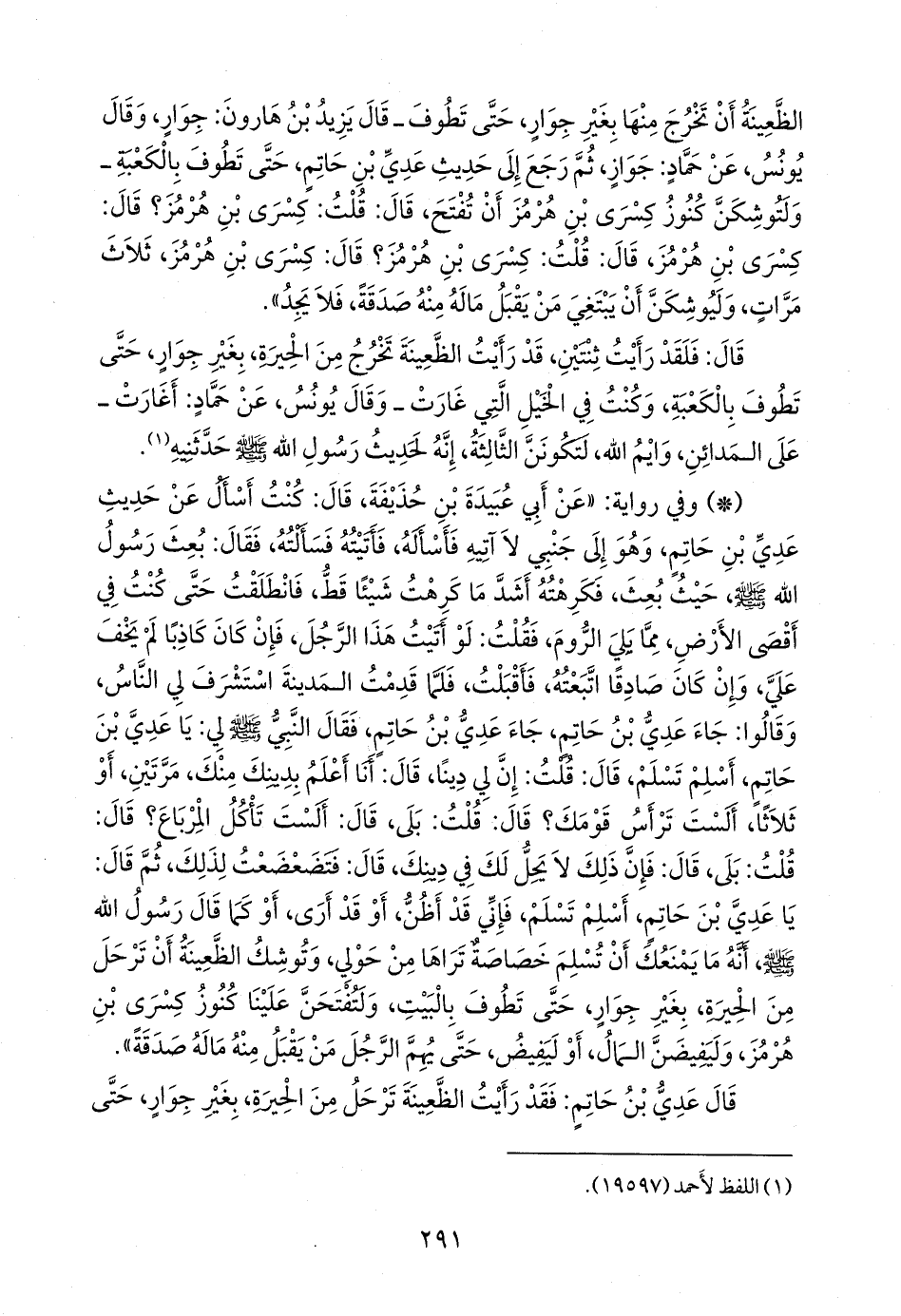 - وفي رواية: «عن أبي عبيدة بن حذيفة، قال: كنت أسأل عن حديث عَدي بن حاتم، وهو إلى جنبي لا آتيه فأسأله، فأتيته فسألته، فقال: بعث رسول الله صَلى الله عَليه وسَلم حيث بعث، فكرهته أشد ما كرهت شيئًا قط، فانطلقت حتى كنت في أقصى الأرض، مما يلي الروم، فقلت: لو أتيت هذا الرجل، فإن كان كاذبا لم يخف علي، وإن كان صادقا اتبعته، فأقبلت، فلما قدمت المدينة استشرف لي الناس، وقالوا: جاء عَدي بن حاتم، جاء عَدي بن حاتم، فقال النبي صَلى الله عَليه وسَلم لي: يا عَدي بن حاتم، أسلم تسلم، قال: قلت: إن لي دينا، قال: أنا أعلم بدينك منك، مرتين، أو ثلاثا، ألست ترأس قومك؟ قال: قلت: بلى، قال: ألست تأكل المرباع؟ قال: قلت: بلى، قال: فإن ذلك لا يحل لك في دينك، قال: فتضعضعت لذلك، ثم قال: يا عَدي بن حاتم، أسلم تسلم، فإني قد أظن، أو قد أرى، أو كما قال رسول الله صَلى الله عَليه وسَلم أنه ما يمنعك أن تسلم خصاصة تراها من حولي, وتوشك الظعينة أن ترحل من الحيرة، بغير جوار، حتى تطوف بالبيت، ولتفتحن علينا كنوز كسرى بن هُرمُز، وليفيضن المال، أو ليفيض، حتى يهم الرجل من يقبل منه ماله صدقة».