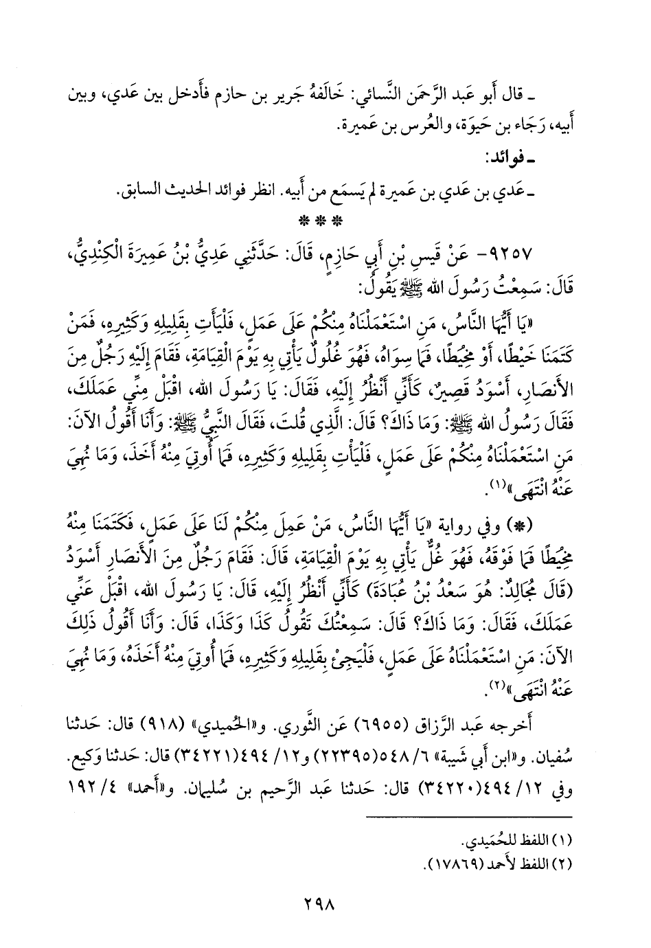 ٩٢٥٧ - عن قيس بن أبي حازم، قال: حدثني عَدي بن عميرة الكندي، قال: سمعت رسول الله صَلى الله عَليه وسَلم يقول: