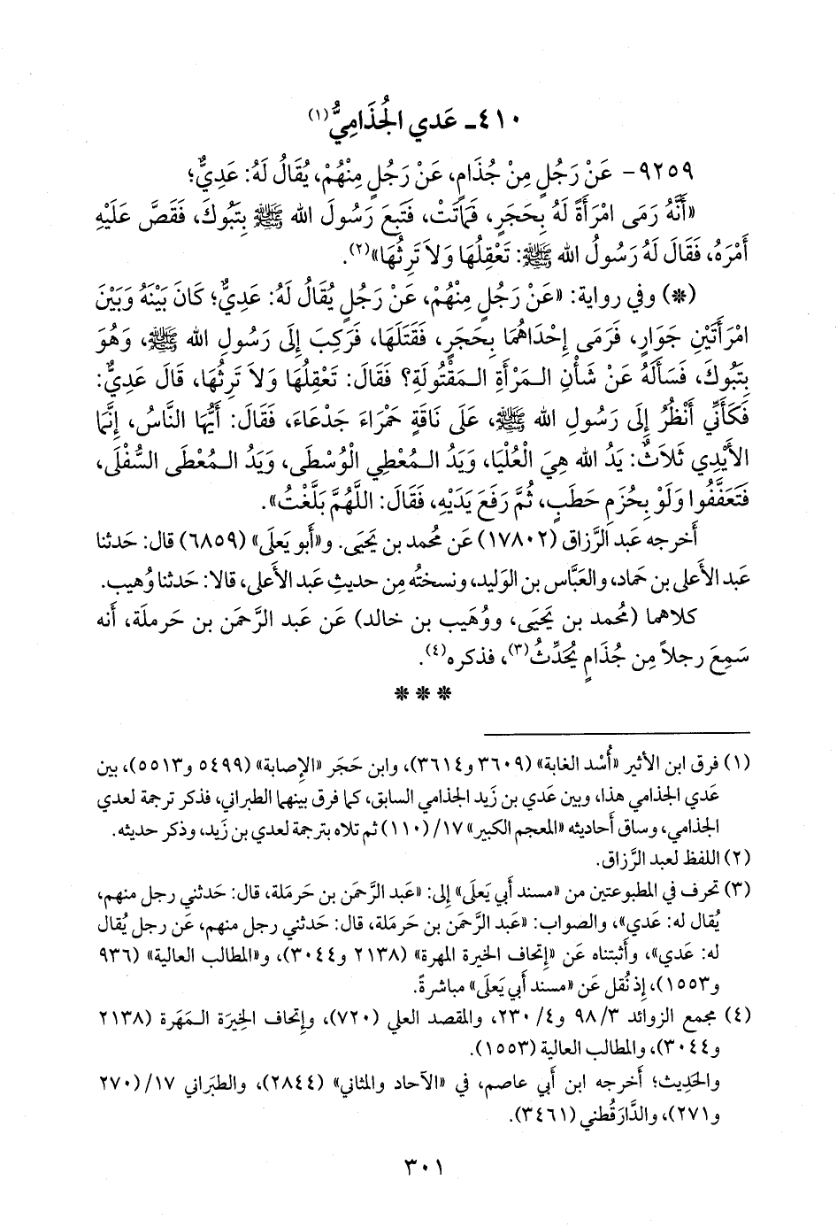 (¬١) فرق ابن الأثير «أسد الغابة» (٣٦٠٩ و ٣٦١٤)، وابن حجر «الإصابة» (٥٤٩٩ و ٥٥١٣)، بين عدي الجذامي هذا، وبين عَدي بن زيد الجذامي السابق، كما فرق بينهما الطبراني، فذكر ترجمة لعدي الجذامي، وساق أحاديثه «المعجم الكبير» ١٧/ (١١٠) ثم تلاه بترجمة لعَدي بن زيد، وذكر حديثه.