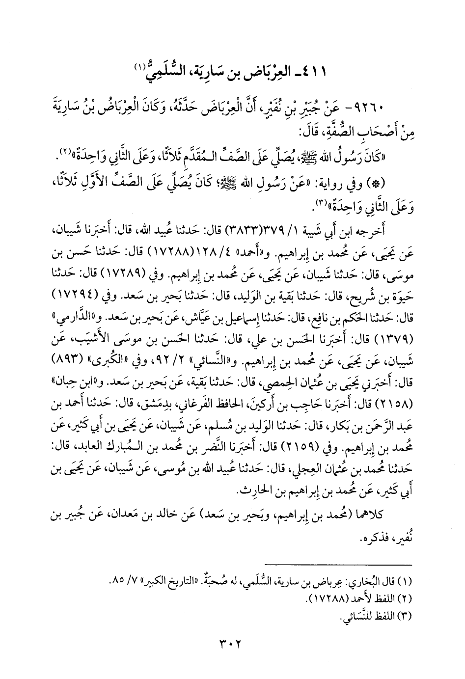 ٩٢٦٠ - عن جُبير بن نُفير، أن العرباض حدثه، وكان العرباض بن سارية من أصحاب الصفة، قال: