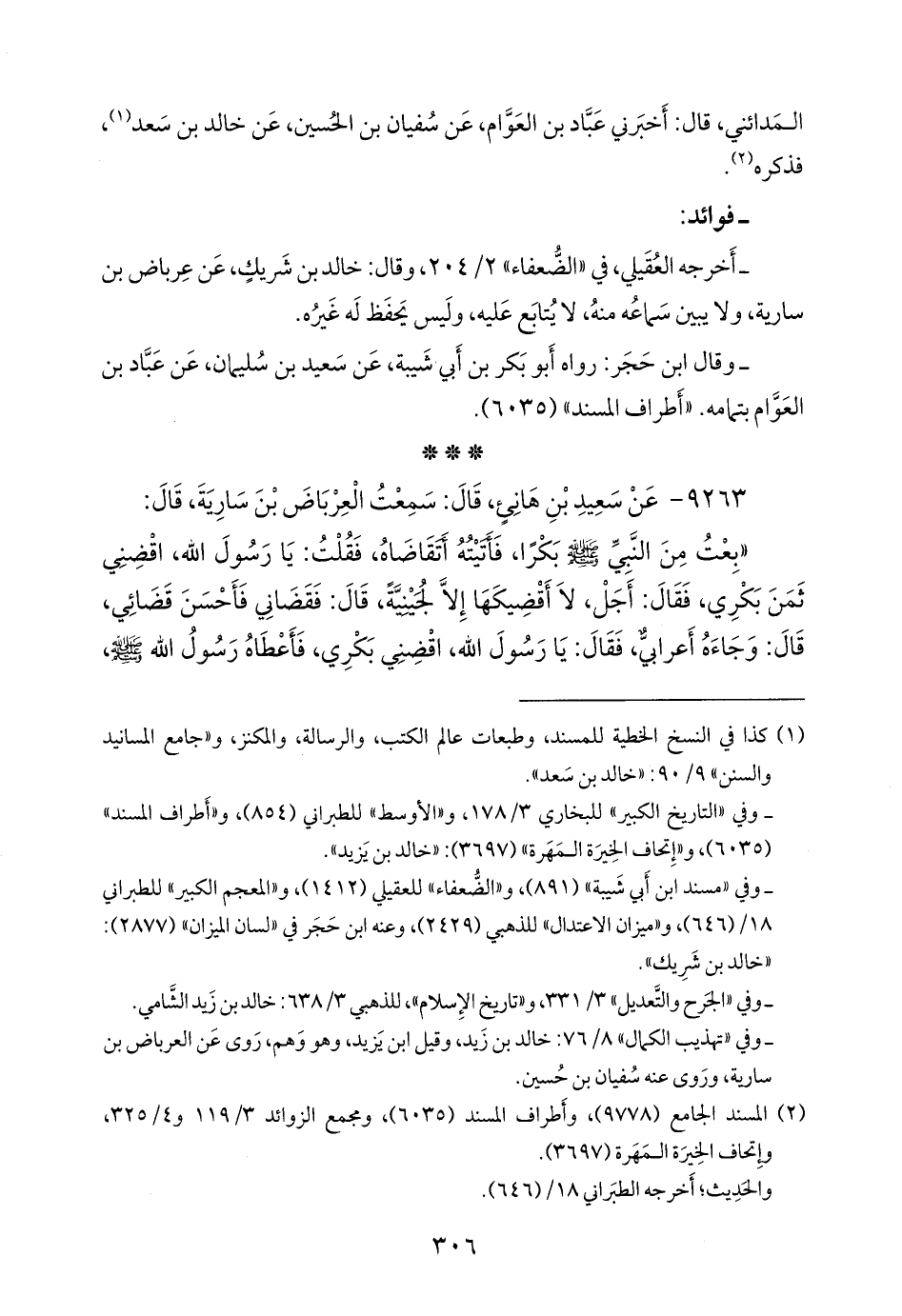 ٩٢٦٣ - عن سعيد بن هانئ، قال: سمعت العرباض بن سارية، قال: