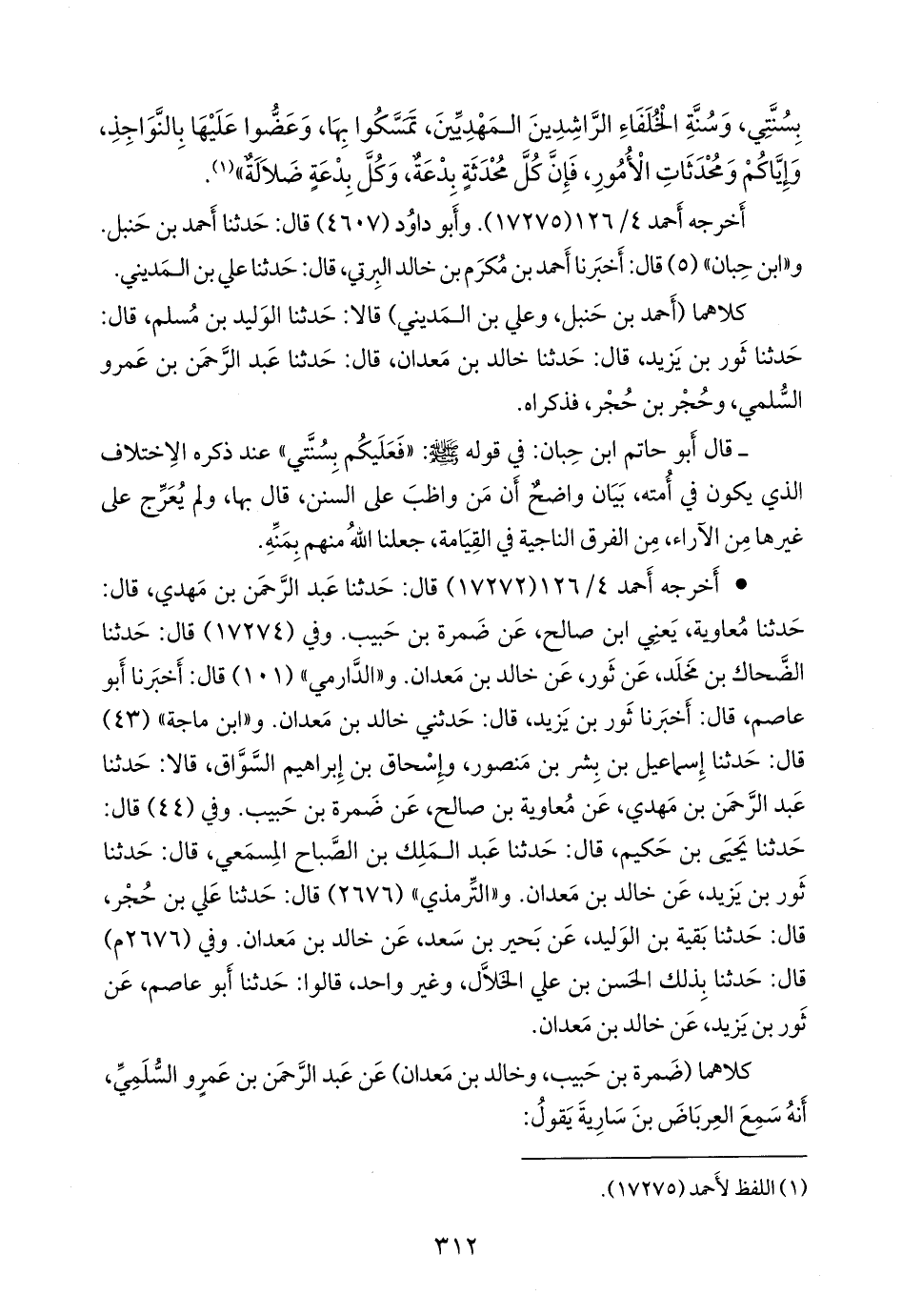 • أخرجه أحمد (١٧٢٧٢) قال: حدثنا عبد الرَّحمَن بن مهدي، قال: حدثنا معاوية، يعني ابن صالح، عن ضمرة بن حبيب. وفي (١٧٢٧٤) قال: حدثنا الضحاك بن مخلد، عن ثور، عن خالد بن مَعدان. و «الدَّارِمي» (١٠١) قال: أخبرنا أَبو عاصم، قال: أخبرنا ثور بن يزيد، قال: حدثني خالد بن مَعدان. و «ابن ماجة» (٤٣) قال: حدثنا إسماعيل بن بشر بن منصور، وإسحاق بن إبراهيم السواق، قالا: حدثنا عبد الرَّحمَن بن مهدي، عن معاوية بن صالح، عن ضمرة بن حبيب. وفي (٤٤) قال: حدثنا يحيى بن حكيم، قال: حدثنا عبد الملك بن الصباح المسمعي، قال: حدثنا ثور بن يزيد، عن خالد بن مَعدان. و «التِّرمِذي» (٢٦٧٦) قال: حدثنا علي بن حُجْر، قال: حدثنا بَقيَّة بن الوليد، عن بَحِير بن سعد, عن خالد بن مَعدان. وفي (٢٦٧٦ م) قال: حدثنا بذلك الحسن بن علي الخَلَّال، وغير واحد، قالوا: حدثنا أَبو عاصم، عن ثور بن يزيد، عن خالد بن مَعدان.