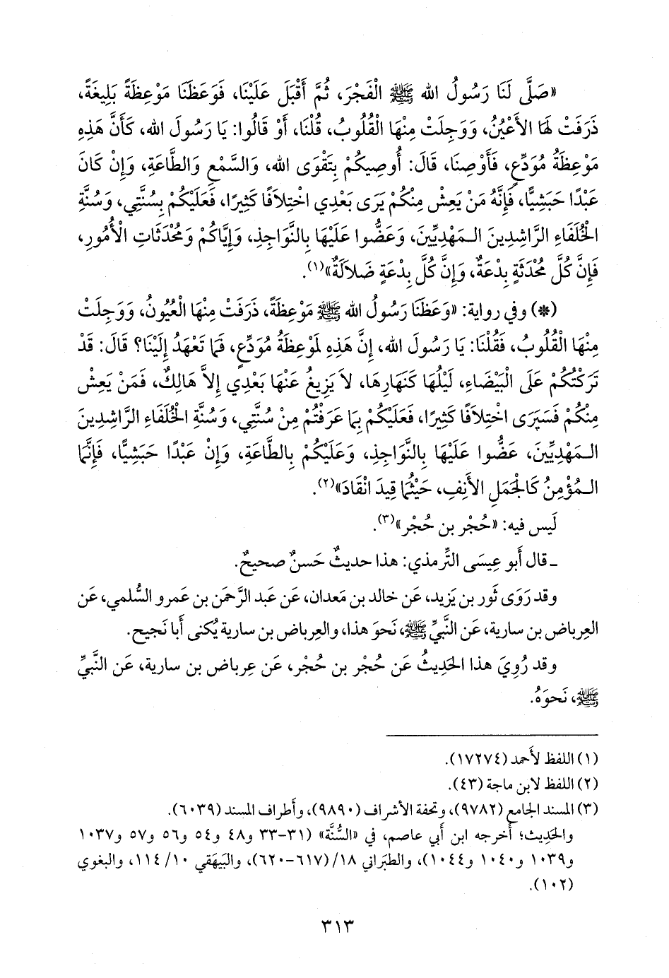 - وفي رواية: «وعظنا رسول الله صَلى الله عَليه وسَلم موعظة، ذرفت منها العيون، ووجلت منها القلوب، فقلنا: يا رسول الله، إن هذه لموعظة مودع، فما تعهد إلينا؟ قال: قد تركتكم على البيضاء، ليلها كنهارها، لا يزيغ عنها بعدي إلا هالك، فمن يعش منكم فسيرى اختلافا كثيرا، فعليكم بما عرفتم من سنتي، وسنة الخلفاء الراشدين المهديين، عضوا عليها بالنواجذ، وعليكم بالطاعة، وإن عبدًا حبشيا، فإنما المؤمن كالجمل الأنف، حيثما قيد انقاد» (¬١).