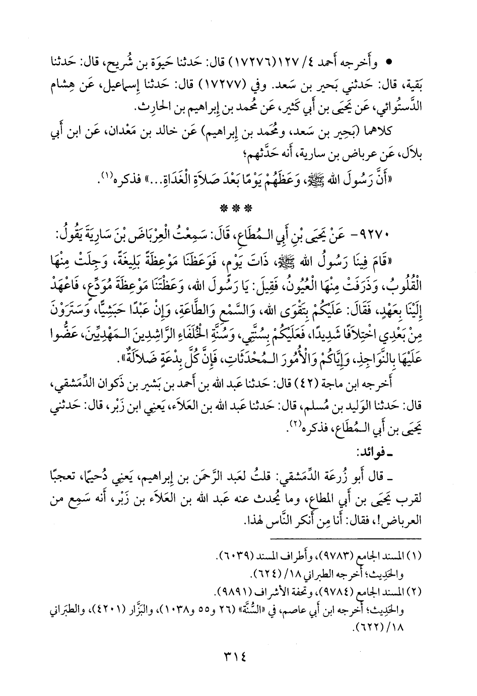 ٩٢٧٠ - عن يحيى بن أبي المطاع، قال: سمعت العرباض بن سارية يقول: