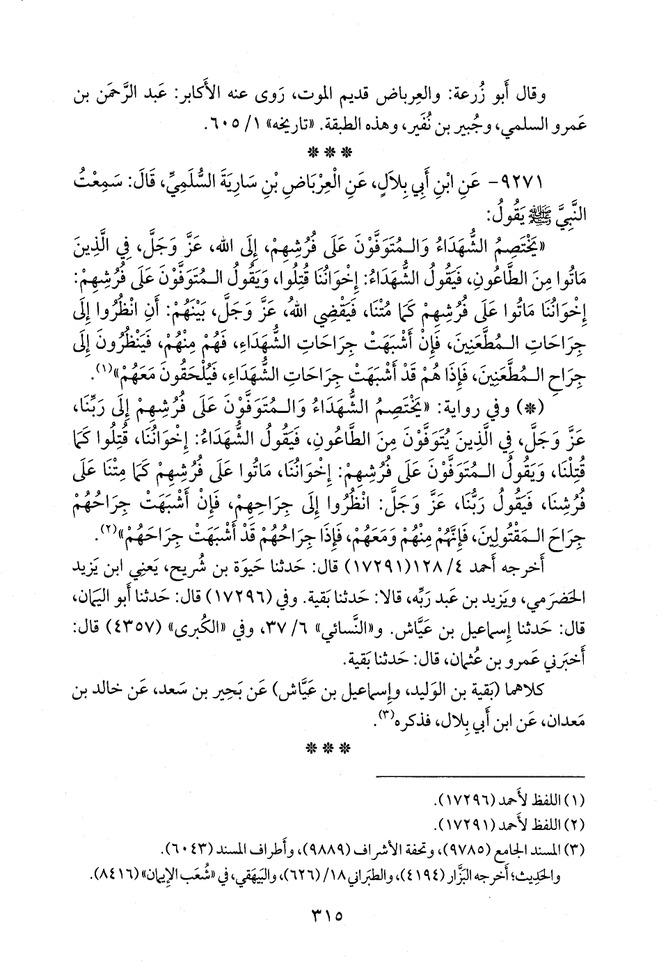 - وفي رواية: «يختصم الشهداء والمتوفون على فرشهم إلى ربنا، عز وجل، في الذين يتوفون من الطاعون، فيقول الشهداء: إخواننا، قتلوا كما قتلنا، ويقول المتوفون على فرشهم: إخواننا، ماتوا على فرشهم كما متنا على فرشنا، فيقول ربنا، عز وجل: انظروا إلى جراحهم، فإن أشبهت جراحهم جراح المقتولين، فإنهم منهم ومعهم، فإذا جراحهم قد أشبهت جراحهم» (¬٢).