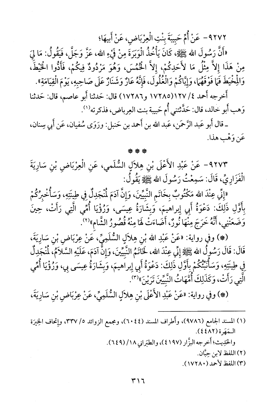 - وفي رواية: «عن عبد الله بن هلال السلمي، عن عرباض بن سارية, قال: قال رسول الله صَلى الله عَليه وسَلم إني عند الله، لخاتم النبيين، وإن آدم، عليه السلام، لمنجدل في طينته، وسأنبئكم بأول ذلك: دعوة أبي إبراهيم، وبشارة عيسى بي، ورؤيا أمي التي رأت، وكذلك أمهات النبيين ترين» (¬٢).