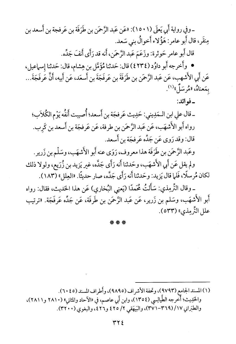 - وقال التِّرمِذي: سألتُ محمدًا، يعني ابن إسماعيل البخاري، عن هذا الحديث، فقال: رواه أَبو الأشهب، وسَلْم بن زَرير، عن عبد الرَّحمَن بن طرفة، عن جَدِّه عرفجة. «ترتيب علل التِّرمِذي» (٥٣٣).
