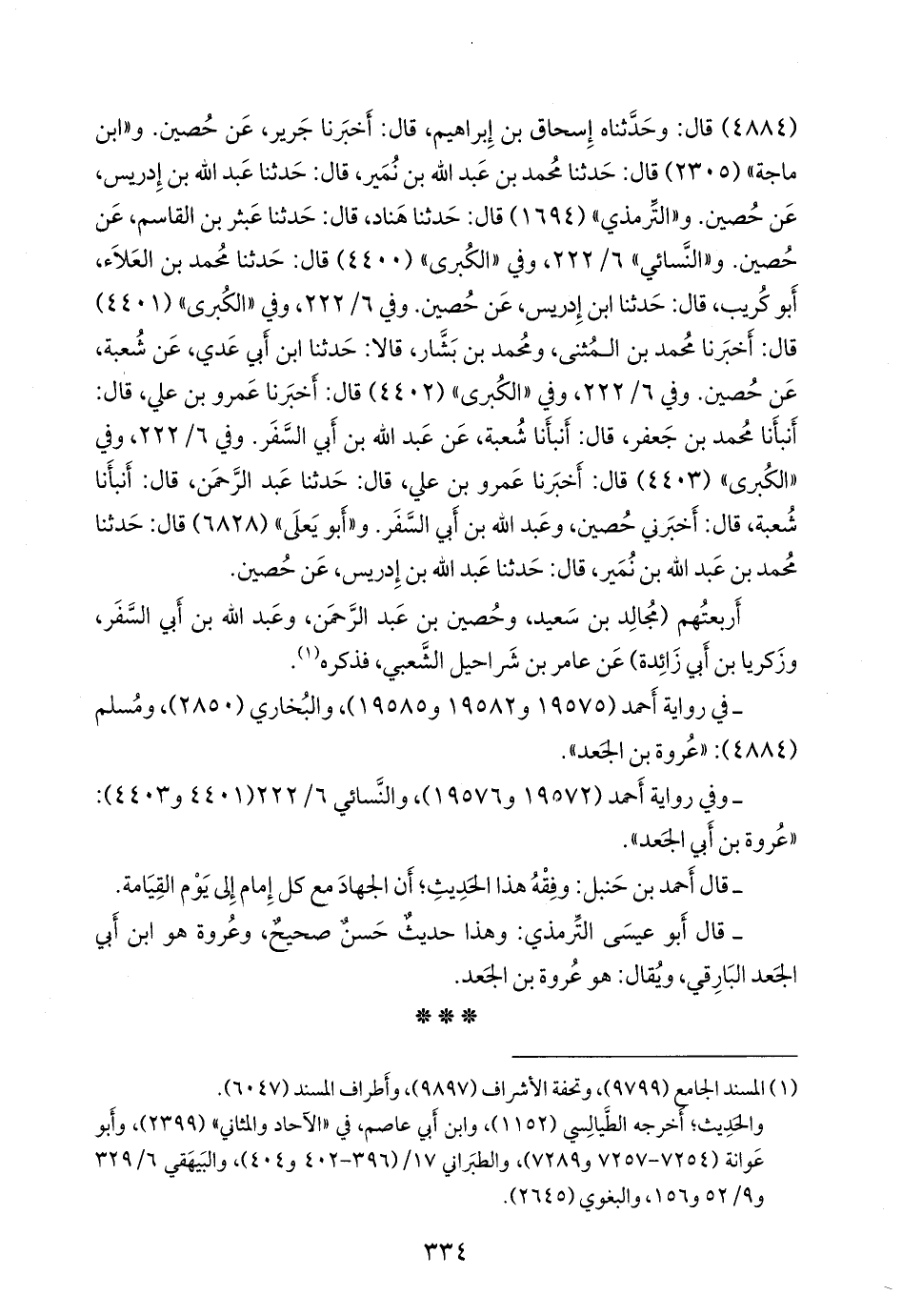 - قال التِّرمِذي: هذا حديثٌ حسنٌ صحيحٌ، وعروة هو ابن أبي الجعد البارقي، ويقال: عروة بن الجعد.