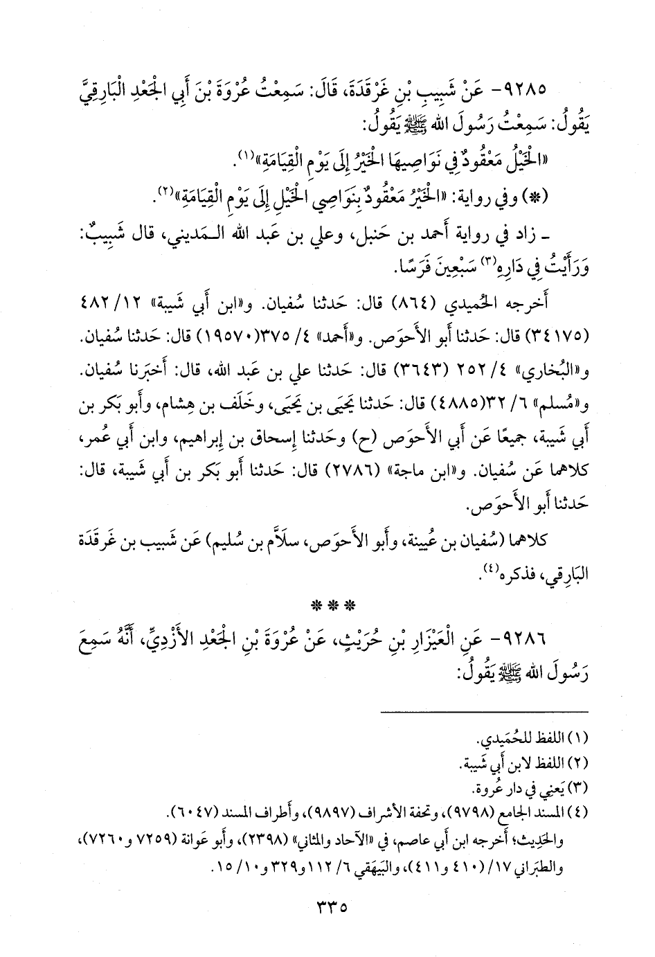 ٩٢٨٥ - عن شبيب بن غرقدة، قال: سمعت عروة بن أبي الجعد البارقي يقول: سمعت رسول الله صَلى الله عَليه وسَلم يقول: