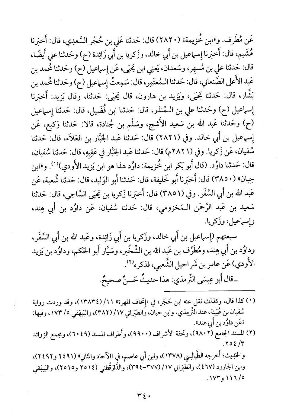 و «ابن خزيمة» (٢٨٢٠) قال: حدثنا علي بن حُجْر السعدي، قال: أخبرنا هُشيم، قال: أخبرنا إسماعيل بن أبي خالد، وزكريا بن أبي زائدة (ح) وحدثنا علي أيضا، قال: حدثنا علي بن مُسهِر، وسعدان، يعني ابن يحيى، عن إسماعيل (ح) وحدثنا محمد بن عبد الأعلى الصَّنْعاني، قال: حدثنا المُعتَمِر، قال: سمعت إسماعيل (ح) وحدثنا محمد بن بشار، قال: حدثنا يحيى، ويزيد بن هارون، قال يحيى: حدثنا، وقال يزيد: أخبرنا إسماعيل (ح) وحدثنا علي بن المنذر، قال: حدثنا ابن فضيل، قال: حدثنا إسماعيل (ح) وحدثنا عبد الله بن سعيد الأشج، وسَلْم بن جُنادة، قالا: حدثنا وكيع، عن إسماعيل بن أبي خالد. وفي (٢٨٢١) قال: حدثنا عبد الجبار بن العلاء، قال: حدثنا سفيان، عن زكريا. وفي (٢٨٢١ م) قال: حدثنا عبد الجبار في عقبه، قال: حدثنا سفيان، قال: حدثنا داود. (قال ابن خزيمة: داود هذا هو ابن يزيد الأَوْدي) (¬١). و «ابن حِبَّان» (٣٨٥٠) قال: أخبرنا أَبو خليفة، قال: حدثنا أَبو الوليد، قال: حدثنا شعبة، عن عبد الله بن أبي السفر. وفي (٣٨٥١) قال: أخبرنا زكريا بن يحيى الساجي، قال: حدثنا سعيد بن عبد الرَّحمَن المخزومي، قال: حدثنا سفيان، عن داود بن أبي هند، وإسماعيل، وزكريا.