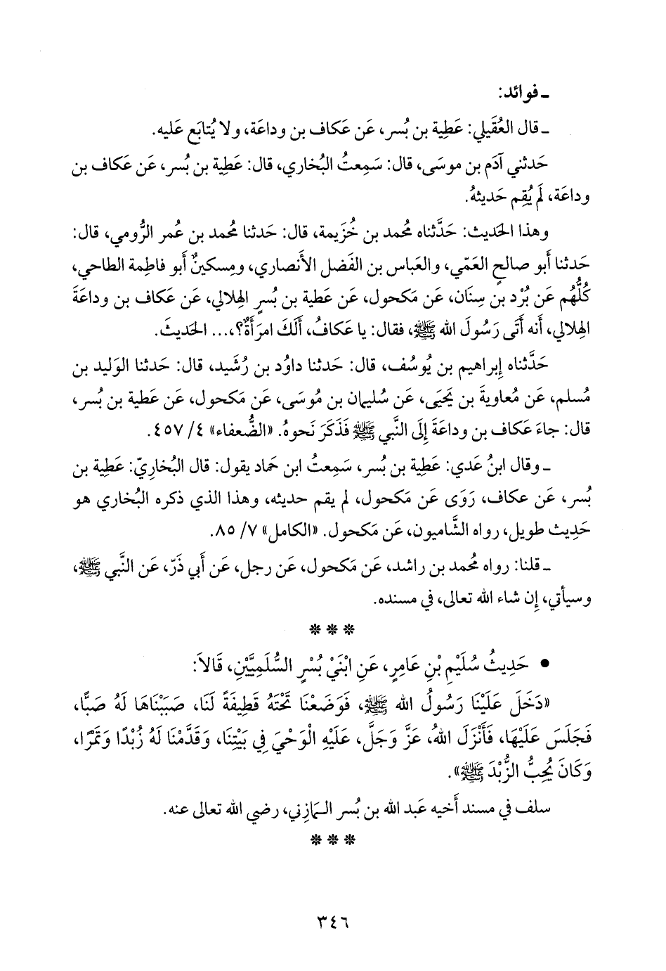 حدثناه إبراهيم بن يوسف، قال: حدثنا داود بن رشيد، قال: حدثنا الوليد بن مسلم، عن معاوية بن يحيى، عن سليمان بن موسى، عن مكحول، عن عطية بن بسر، قال: جاء عكاف بن وداعة إلى النبي صَلى الله عَليه وسَلم فذكر نحوه. «الضعفاء» ٤/ ٤٥٧.